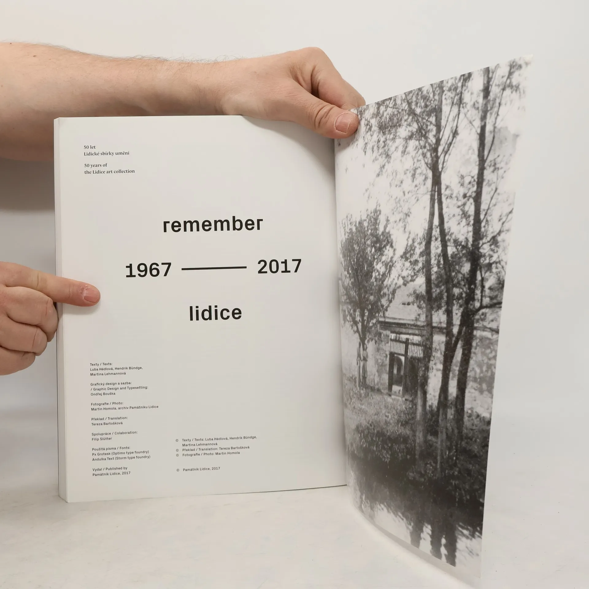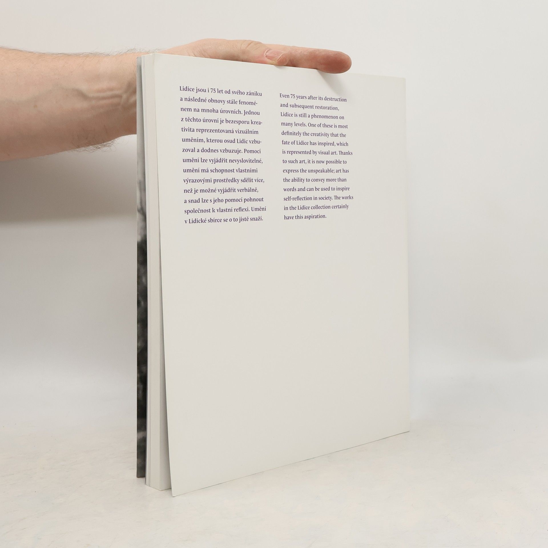 Česko-anglický katalog Lidické sbírky umění 20. a 21. století vydaný u příležitosti 50. výročí jejího založení. René Block se po padesáti letech opět vrací do Lidic, aby po dvou předchozích donacích – z šedesátých a v poté z devadesátých let – obohatil místní sbírku výtvarného umění o další více než čtyři desítky uměleckých děl. Jednoduché konstatování, významné datum, skvělý galerista s obrovským smyslem pro to důležité, co umění přináší společnosti... Ale jak se to celé přihodilo, jaký to má význam? Lidice jsou i 75 let od svého zániku a následné obnovy stále fenoménem na mnoha úrovních. Jednou z těchto úrovní je bezesporu kreativita reprezentovaná vizuálním uměním, kterou osud Lidic vzbuzoval a dodnes vzbuzuje. Pomocí umění lze vyjádřit nevyslovitelné, umění má schopnost vlastními výrazovými prostředky sdělit více, než je možné vyjádřit verbálně, a snad lze s jeho pomocí pohnout společnost k vlastní reflexi. Umění v Lidické sbírce se o to jistě snaží.