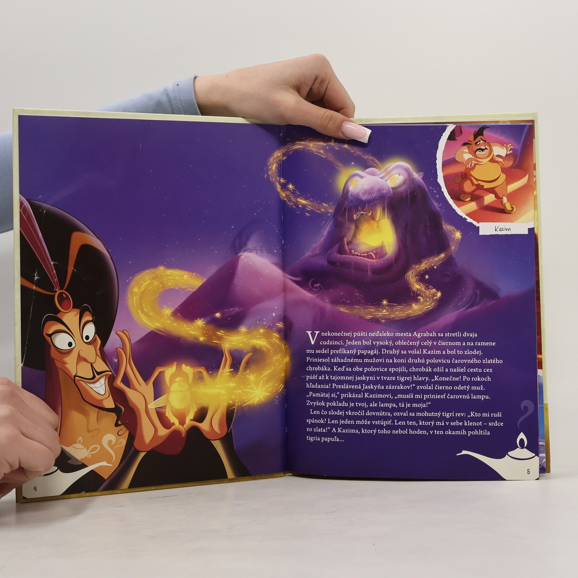 V nekonečnej púšti neďaleko mesta Agrabah sa stretli dvaja cudzinci. Jeden bol vysoký, oblečený celý v čiernom a na ramene mu sedel prefíkaný papagáj. Druhý sa volal Kazim a bol to zlodej. Priniesol záhadnému mužovi na koni druhú polovicu čarovného zlatého chrobáka. Keď sa obe polovice spojili, chrobák ožil a našielcestu cez púšť až k tajomnej jaskyni v tvare tigrej hlavy.
