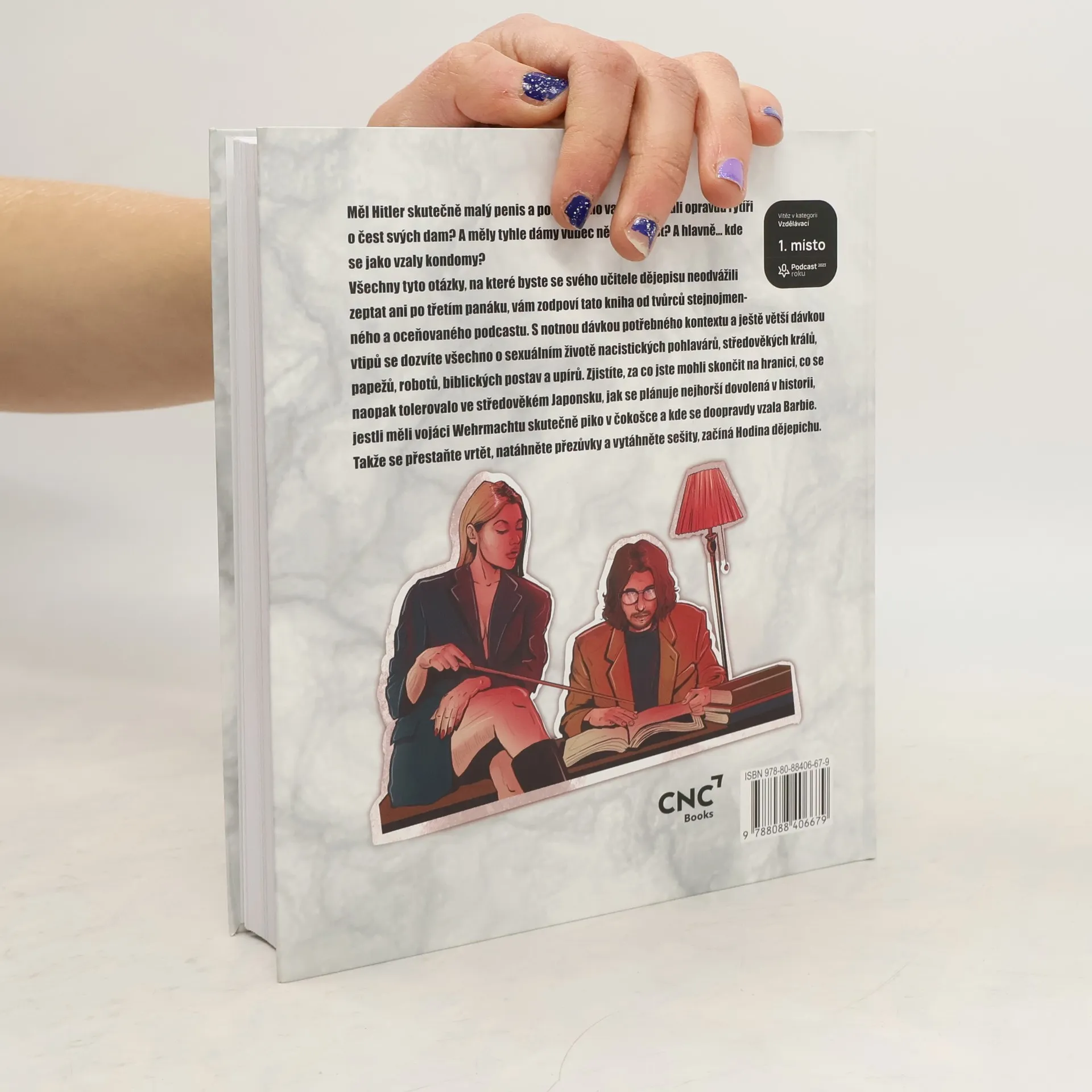 Měl Hitler skutečně malý penis a pouze jedno varle? Bojovali opravdu rytíři o čest svých dam? A měly tyhle dámy vůbec nějakou čest? A hlavně… kde se jako vzaly kondomy? Všechny tyto otázky, na které byste se svého učitele dějepisu neodvážili zeptat ani po třetím panáku, vám zodpoví tato kniha od tvůrců stejnojmenného a oceňovaného podcastu. S notnou dávkou potřebného kontextu a ještě větší dávkou vtipů se dozvíte všechno o sexuálním životě nacistických pohlavárů, středověkých králů, papežů, robotů, biblických postav a upírů. Zjistíte, za co jste mohli skončit na hranici, co se naopak tolerovalo ve středověkém Japonsku, jak se plánuje nejhorší dovolená v historii, jestli měli vojáci Wehrmachtu skutečně piko v čokošce a kde se doopravdy vzala Barbie. Takže se přestaňte vrtět, natáhněte přezůvky a vytáhněte sešity, začíná Hodina dějepichu.