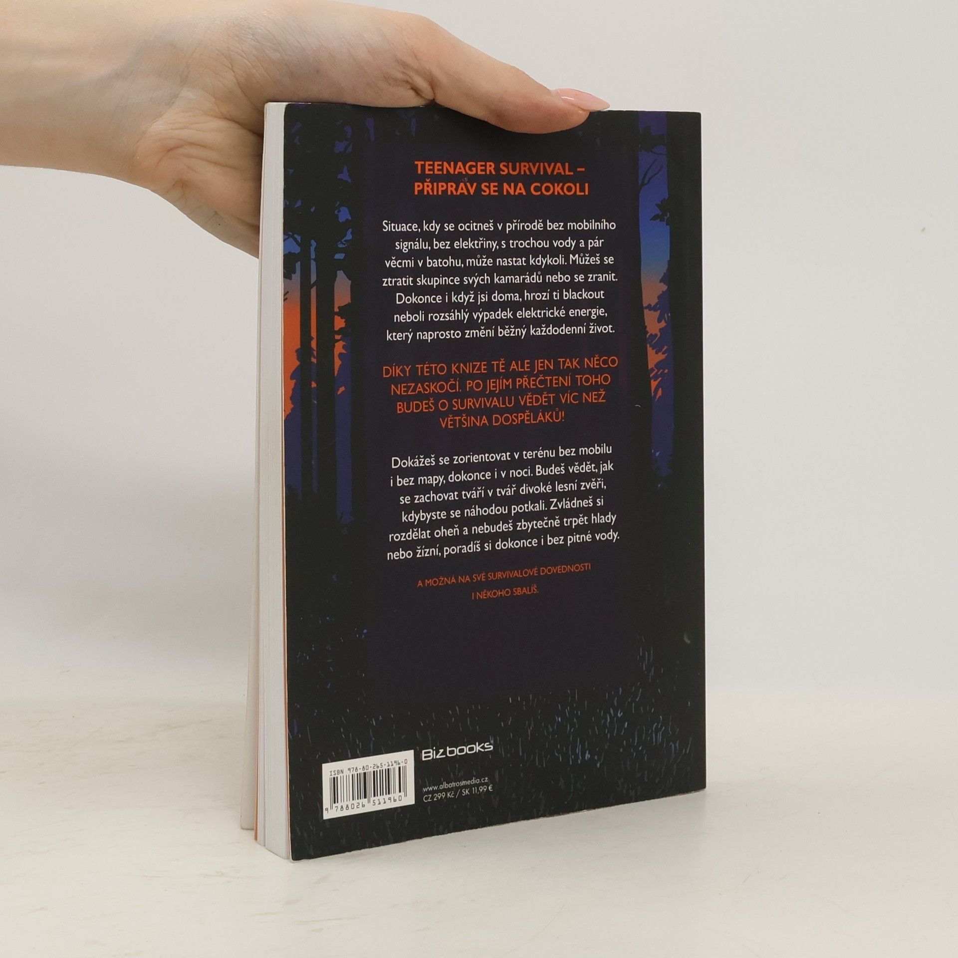 Teenager survival - připrav se na cokoli! Situace, kdy se ocitneš v přírodě bez signálu, bez elektřiny, s trochou vody a pár věcmi v batohu, může nastat kdykoli. Můžeš se ztratit skupince svých kamarádů nebo se zranit. Dokonce i když jsi doma, hrozí ti blackout neboli rozsáhlý výpadek elektrické energie, který naprosto změní běžný každodenní život. Díky této knize tě ale jen tak něco nezaskočí. Po jejím přečtení toho budeš o survivalu vědět víc než většina dospěláků! Zvládneš se zorientovat v terénu bez mapy, dokonce i v noci. Budeš vědět, jak se zachovat tváří v tvář divoké lesní zvěři, kdybyste se náhodou potkali. Zvládneš si rozdělat oheň a nebudeš zbytečně trpět hlady nebo žízní, poradíš si dokonce bez pitné vody.
