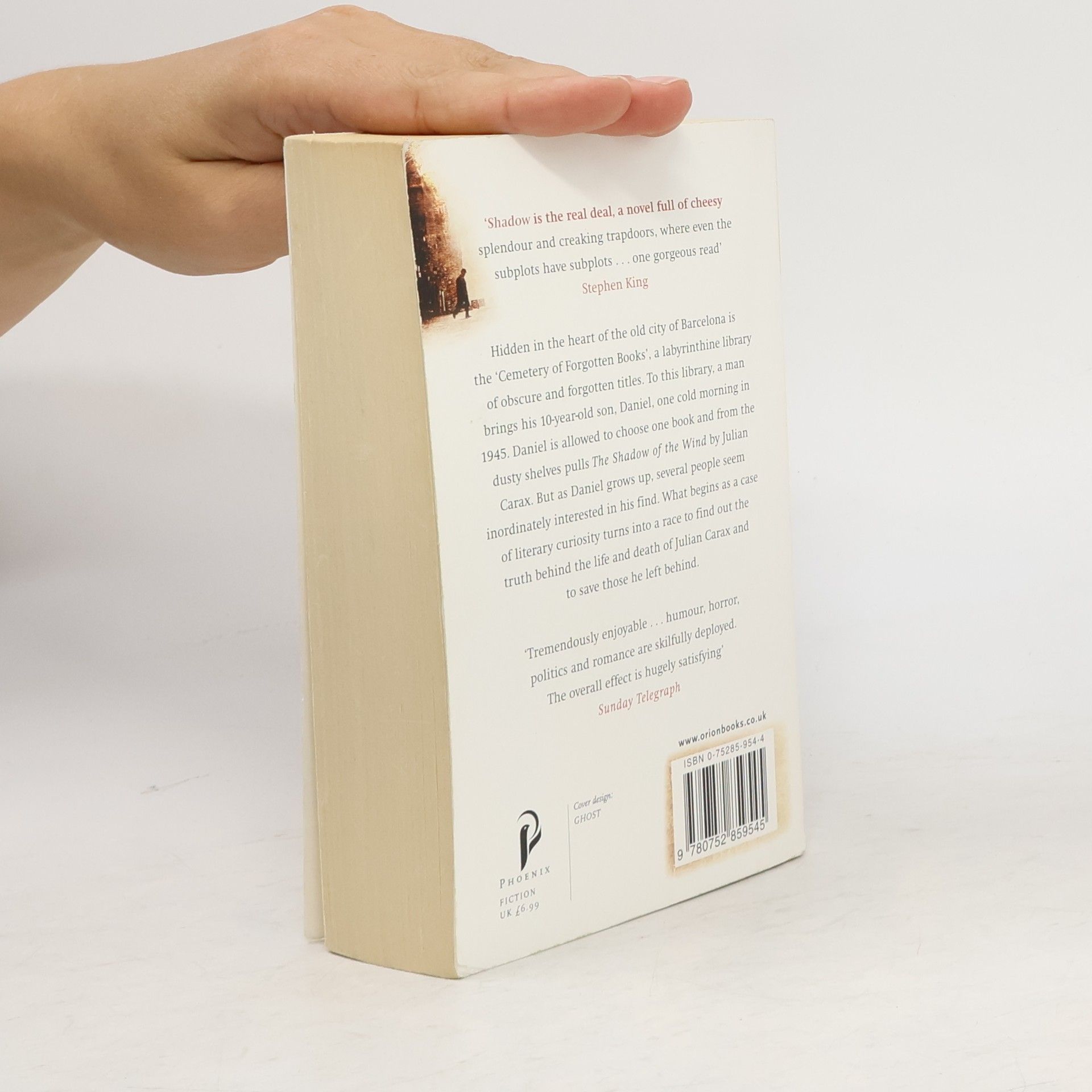 Hidden in the heart of the old city of Barcelona is the 'cemetery of lost books', a labyrinthine library of obscure and forgotten titles that have long gone out of print. To this library, a man brings his 10-year-old son Daniel one cold morning in 1945. Daniel is allowed to choose one book from the shelves and pulls out 'La Sombra del Viento' by Julian Carax. But as he grows up, several people seem inordinately interested in his find. Then, one night, as he is wandering the old streets once more, Daniel is approached by a figure who reminds him of a character from La Sombra del Viento, a character who turns out to be the devil. This man is tracking down every last copy of Carax's work in order to burn them. What begins as a case of literary curiosity turns into a race to find out the truth behind the life and death of Julian Carax and to save those he left behind. A page-turning exploration of obsession in literature and love, and the places that obsession can lead.