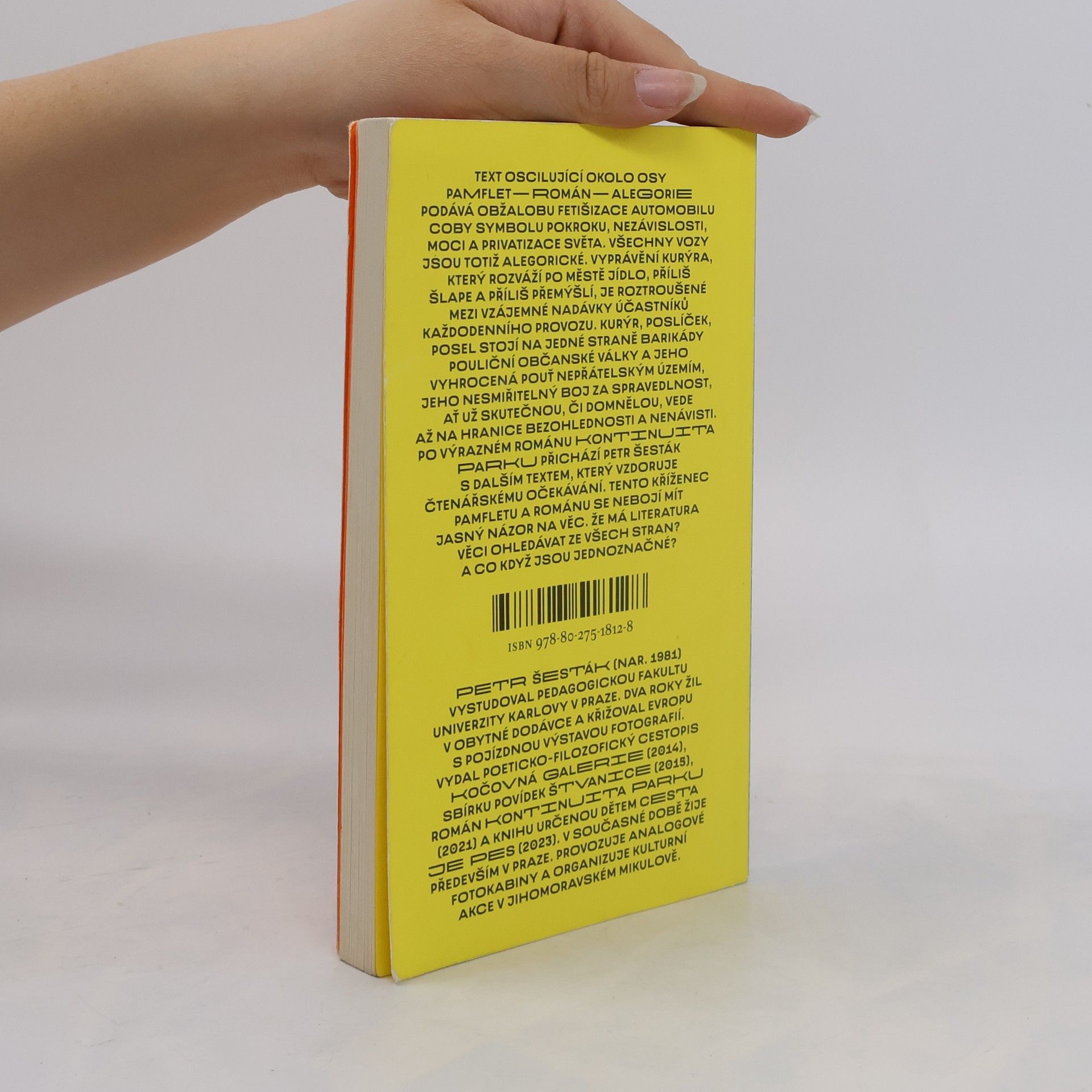 Románový pamflet o životě člověka ve světě aut Text oscilující okolo osy pamflet—román—alegorie podává obžalobu fetišizace automobilu coby symbolu pokroku, nezávislosti, moci a privatizace světa. Všechny vozy jsou totiž alegorické. Vyprávění kurýra, který rozváží po městě jídlo, příliš šlape a příliš přemýšlí, je roztroušené mezi vzájemné nadávky účastníků každodenního provozu. Kurýr, poslíček, Posel stojí na jedné straně barikády pouliční občanské války a jeho vyhrocená pouť nepřátelským územím, jeho nesmiřitelný boj za spravedlnost, ať už skutečnou, či domnělou, vede až na hranice bezohlednosti a nenávisti. Po výrazném románu Kontinuita parku přichází Petr Šesták s dalším textem, který vzdoruje čtenářskému očekávání. Tento kříženec pamfletu a románu se nebojí mít jasný názor na věc. Že má literatura věci ohledávat ze všech stran? A co když jsou jednoznačné?