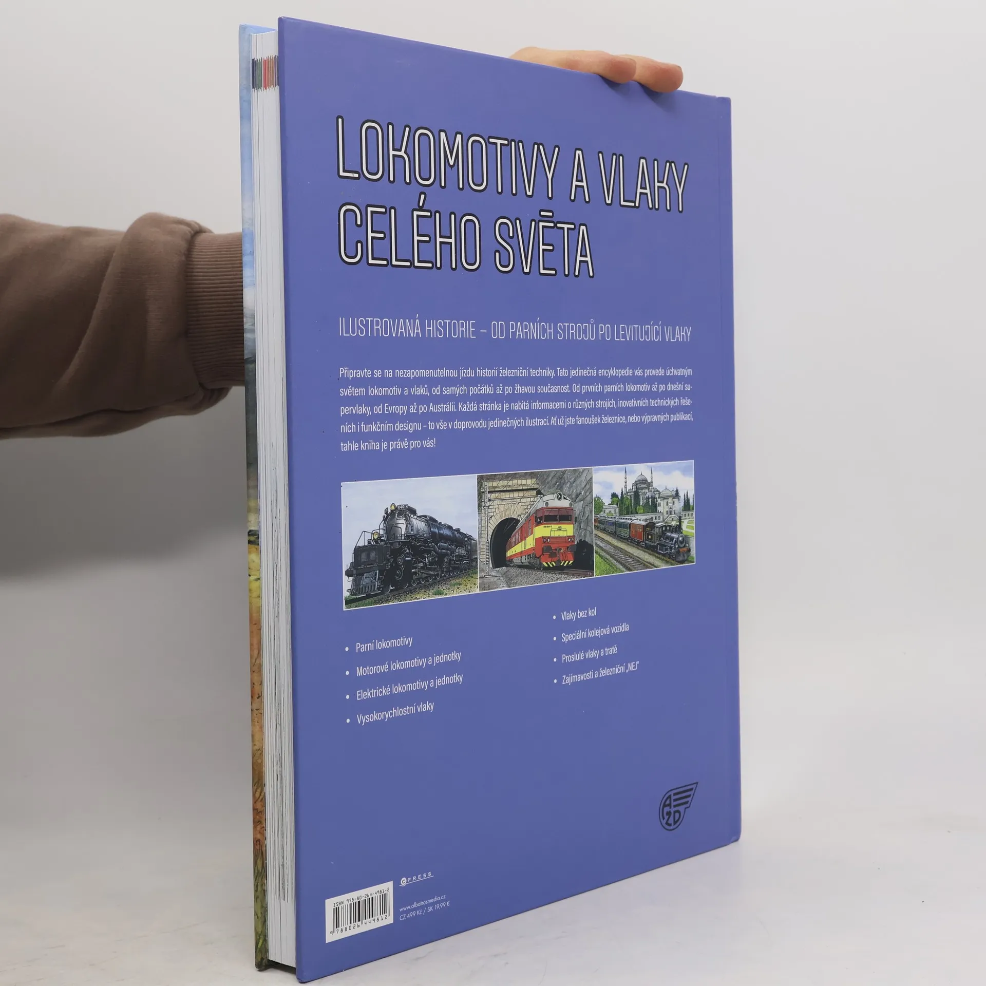 Od páry po supermoderní stroje. Ilustrovaná historie lokomotiv a vlaků. Připravte se na nezapomenutelnou jízdu do historie železniční techniky. Tato obrazová encyklopedie vás provede úchvatným světem lokomotiv a vlaků od samých počátků až po žhavou současnost. Od prvních parních lokomotiv až po dnešní supervlaky, od Evropy až po Austrálii. Každá stránka je nabitá informacemi o různých strojích, inovativních technických řešeních i funkčním designu – to vše v doprovodu jedinečných ilustrací. Ať už jste fanoušek železnice, nebo výpravných publikací, tahle kniha je právě pro vás! *Parní lokomotivy *Motorové lokomotivy a jednotky *Elektrické lokomotivy a jednotky *Vysokorychlostní vlaky *Vlaky bez kol *Speciální kolejová vozidla *Proslulé vlaky a tratě *Zajímavosti a železniční „NEJ“