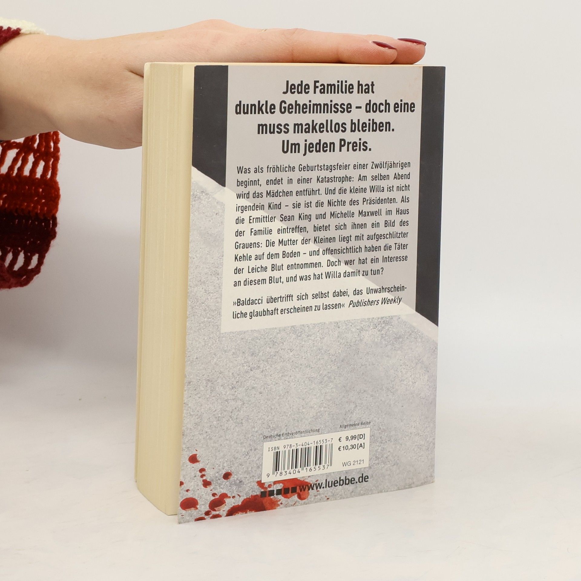 Grausiger Leichenfund und blutige Rätsel Routiniert und mit einem atemberaubenden Spannungsbogen führt David Baldacci sein bewährtes Ermittlerduo Michelle Maxwell und Sean King durch die anfangs undurchsichtigen Zusammenhänge dieses Thrillers, der sich auf höchster gesellschaftlicher Ebene abspielt. In ihrem vierten Fall stolpern die beiden Privatdetektive fast zufällig in eine Katastrophe, die als fröhliche Geburtstagsfeier einer Zwölfjährigen beginnt: Am selben Abend noch wird das Geburtstagskind entführt. Und die kleine Willa ist nicht irgendein Mädchen - sie ist die Nichte des Präsidenten. Als die Ermittler Sean King und Michelle Maxwell im Haus der Familie eintreffen, bietet sich ihnen ein Bild des Grauens: Die Mutter der Kleinen liegt mit aufgeschlitzter Kehle auf dem Boden - und offensichtlich haben die Täter der Leiche Blut entnommen. Doch wer hat ein Interesse an diesem Blut, und was hat Willa damit zu tun? Im Laufe ihrer Ermittlungen dringen die Detektive immer weiter in ein Netz aus dubiosen Machenschaften ein, die es aufzuschlüsseln gilt. Packende Thriller-Unterhaltung von Bestsellerautor David Baldacci - Der vierte Band um das Ermittler-Duo King und Maxwell.