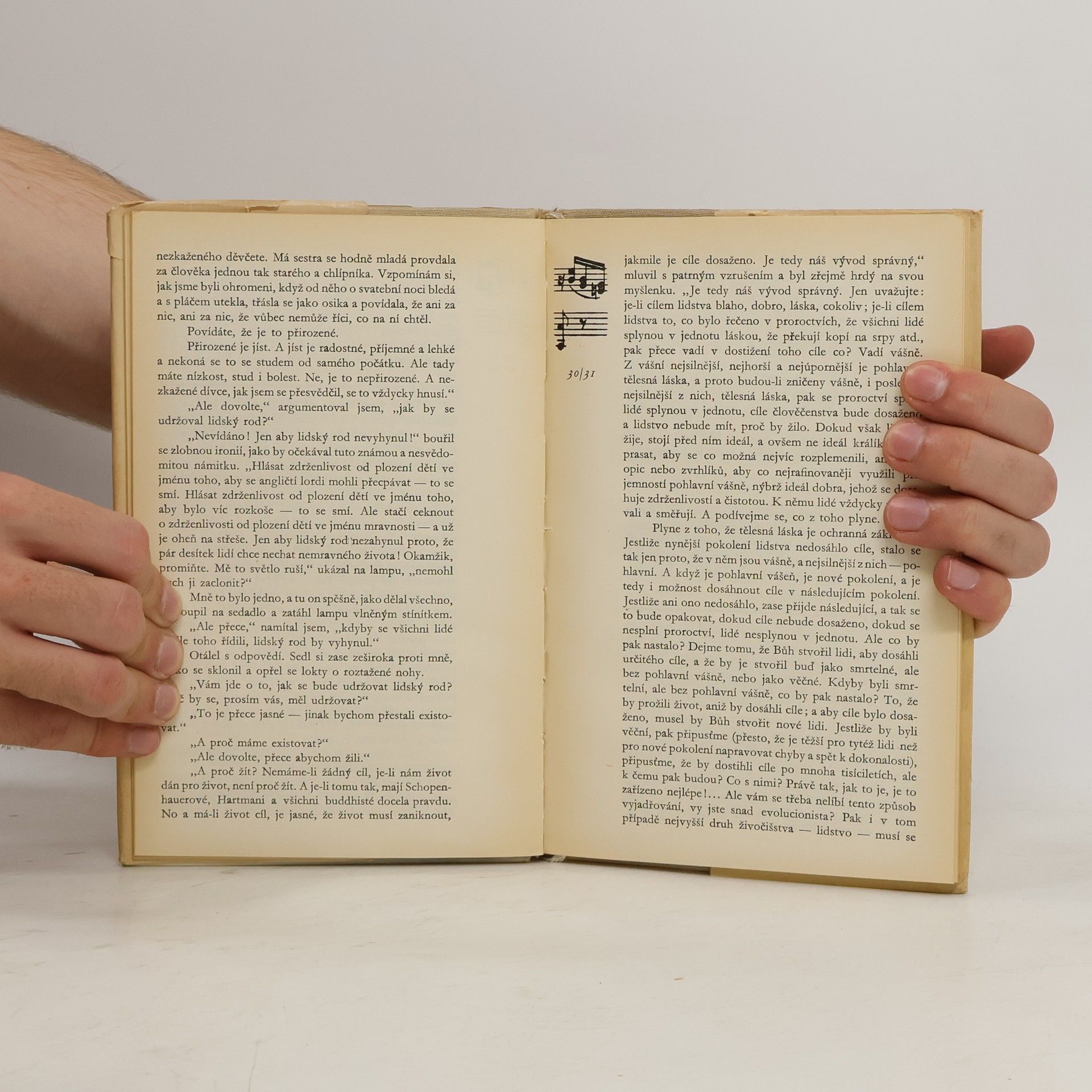 "Byl jsem, jak se říká, zamilován. Nejenže jsem v ní viděl vrchol dokonalosti, ale i sebe jsem od svého zasnoubení považoval za vrchol dokonalosti. Vždyť není takového ničemy, který by, hledá-li, nenašel dost ničemů v některém směru horších, než je sám, a který by tedy nemohl najít důvody a pyšnit se a být na sebe hrdý. Já zrovna tak: neženil jsem se pro peníze, jako se pro peníze nebo protekci ženila většina mých známých - já jsem byl bohatý, ona byla chudá. To byla jedna věc. Druhá věc, na kterou jsem byl pyšný, bylo to, že druzí už při sňatku měli úmysl žít dál a ve stejném mnohoženství, v jakém žili před sňatkem, kdežto já jsem měl pevný úmysl žít po svatbě jen se svou ženou a byl jsem na to hrozně hrdý. Ano, byl jsem strašně nemravný, a myslel jsem si, že jsem anděl."
