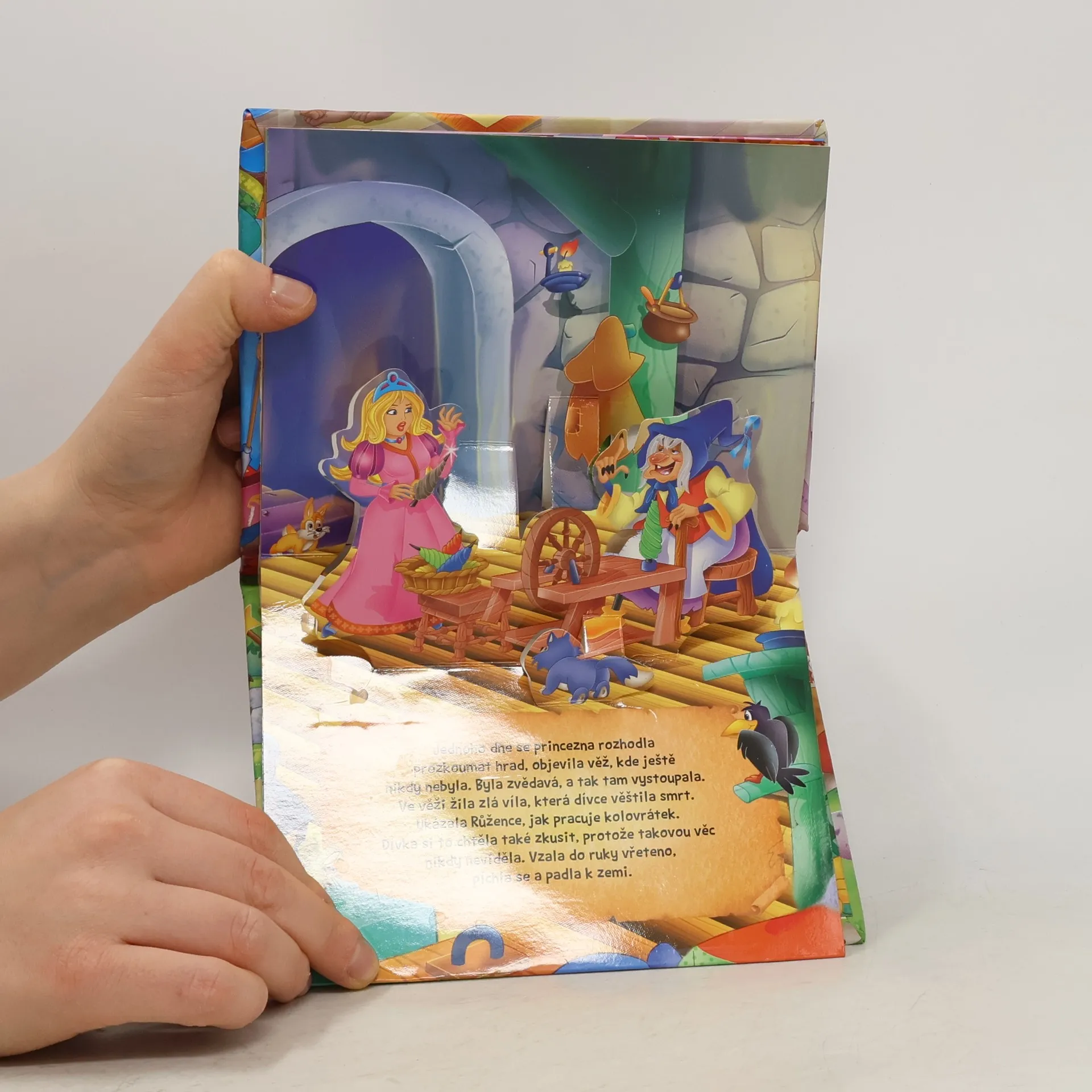 Převyprávěná klasická pohádka o princezně Růžence s obrázky, které po otevření každé dvojstrany dostanou třetí rozměr.