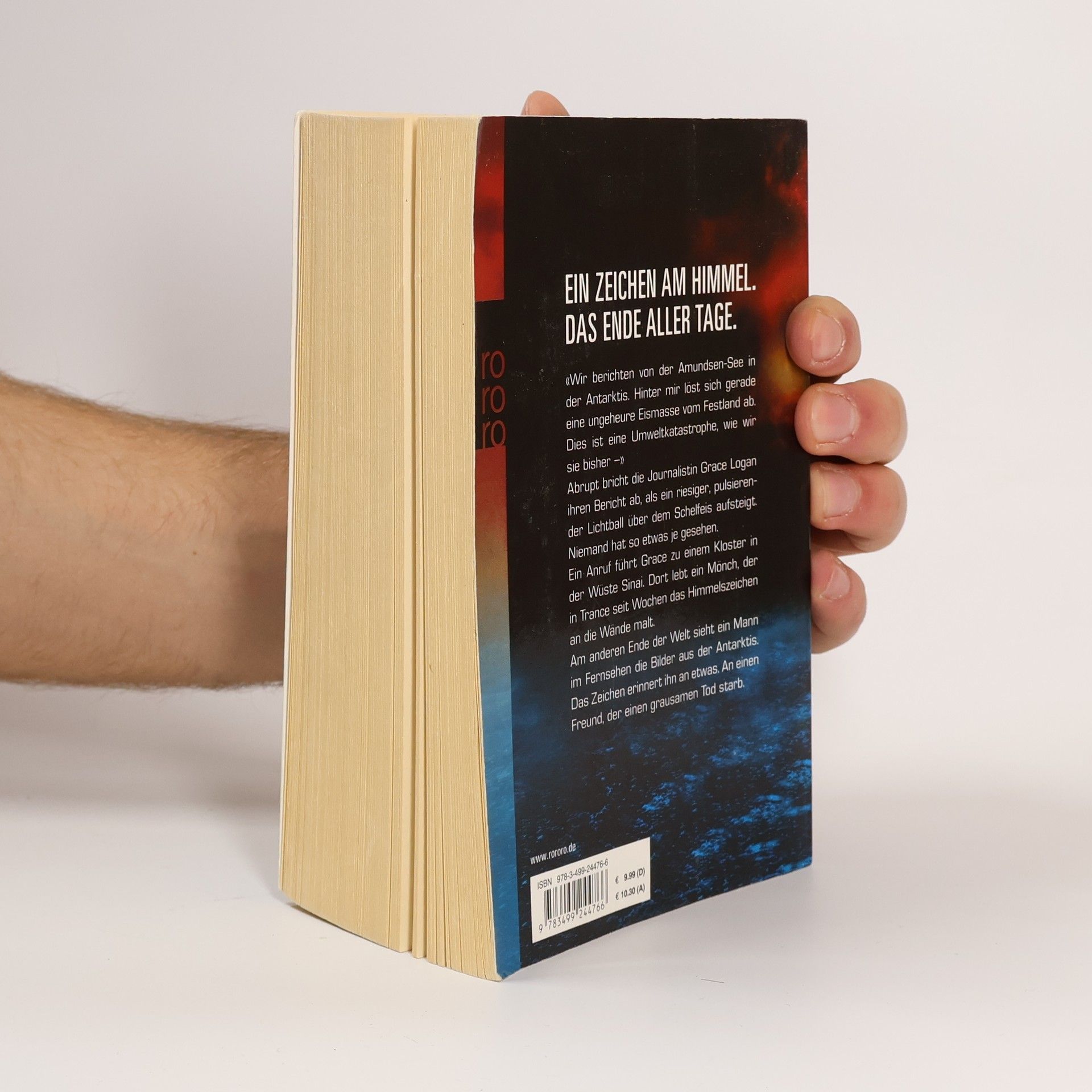 Ein Zeichen am Himmel. Das Ende aller Tage. «Wir berichten von der Amundsen-See in der Antarktis. Hinter mir löst sich gerade eine ungeheure Eismasse vom Festland ab. Dies ist eine Umweltkatastrophe, wie wir sie bisher –» Abrupt bricht die Journalistin Grace Logan ihren Bericht ab, als ein riesiger, pulsierender Lichtball über dem Schelfeis aufsteigt. Niemand hat so etwas je gesehen. Ein Anruf führt Grace zu einem Kloster in der Wüste Sinai. Dort lebt ein Mönch, der in Trance seit Wochen das Himmelszeichen an die Wände malt. Am anderen Ende der Welt sieht ein Mann im Fernsehen die Bilder aus der Antarktis. Das Zeichen erinnert ihn an etwas. An einen Freund, der einen grausamen Tod starb.