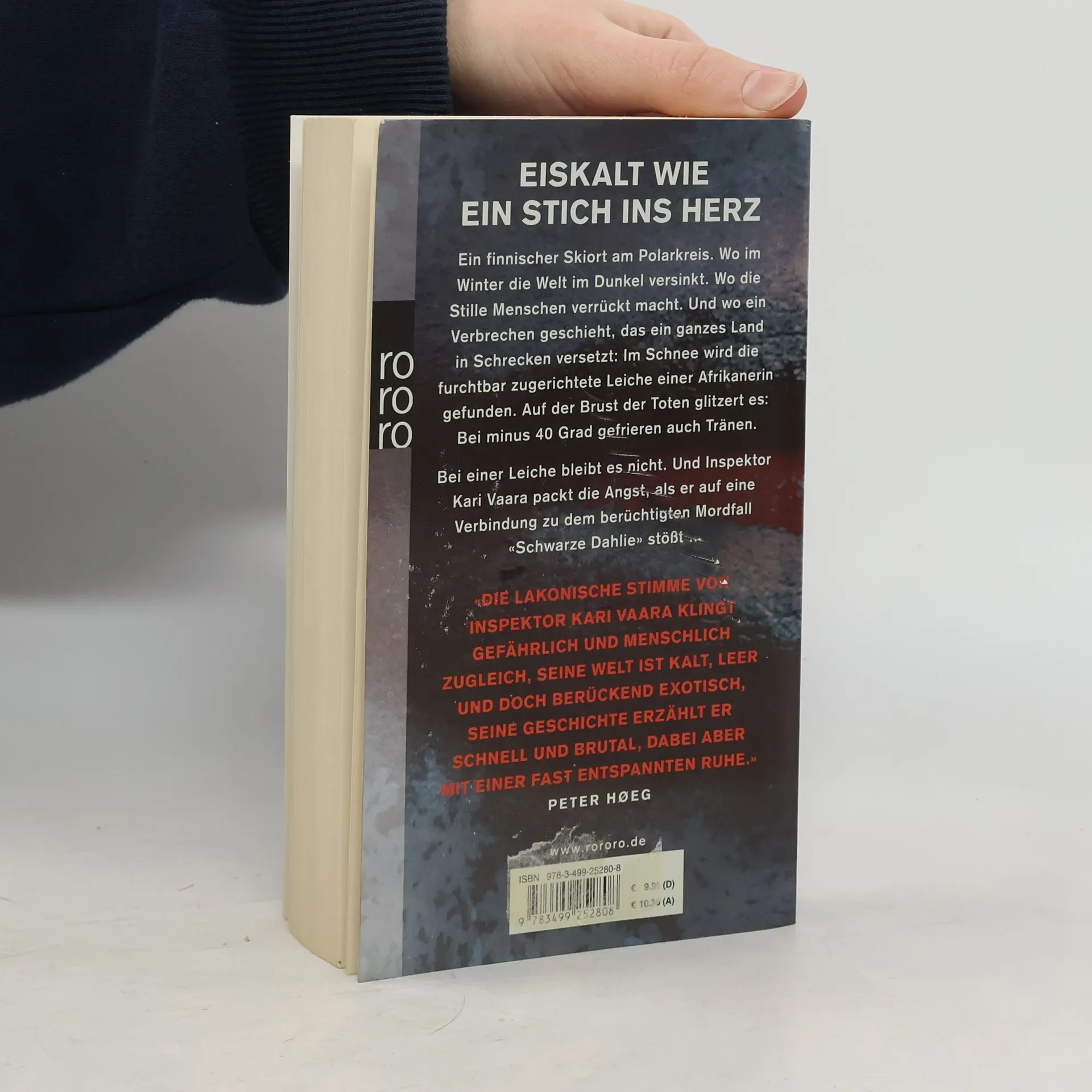 Eiskalt wie ein Stich ins Herz Ein finnischer Skiort am Polarkreis. Wo im Winter die Welt im Dunkel versinkt. Wo die Stille Menschen verrückt macht. Und wo ein Verbrechen geschieht, das ein ganzes Land in Schrecken versetzt: Im Schnee wird die furchtbar zugerichtete Leiche einer Afrikanerin gefunden. Auf der Brust der Toten glitzert es: Bei minus 40 Grad gefrieren auch Tränen. Bei einer Leiche bleibt es nicht. Und Inspektor Kari Vaara packt die Angst, als er auf eine Verbindung zu dem berüchtigten Mordfall «Schwarze Dahlie» stößt ... «Die lakonische Stimme von Inspektor Kari Vaara klingt gefährlich und menschlich zugleich, seine Welt ist kalt, leer und doch berückend exotisch, seine Geschichte erzählt er schnell und brutal, dabei aber mit einer fast entspannten Ruhe.» Peter Høeg