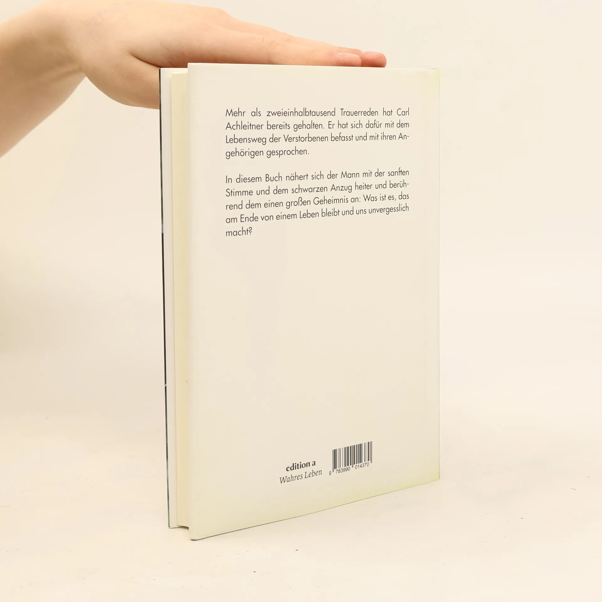 Mehr als 2.500 Trauerreden hat Carl Achleitner bereits gehalten. Er hat sich dafür mit dem Lebensweg der Verstorbenen befasst und mit ihren Angehörigen gesprochen. In diesem Buch nähert sich der Mann mit der sanften Stimme und dem schwarzen Anzug mit Leichtigkeit und Heiterkeit dem einen großen Geheimnis an: Was es ist, das am Ende zählt und uns unvergesslich macht.