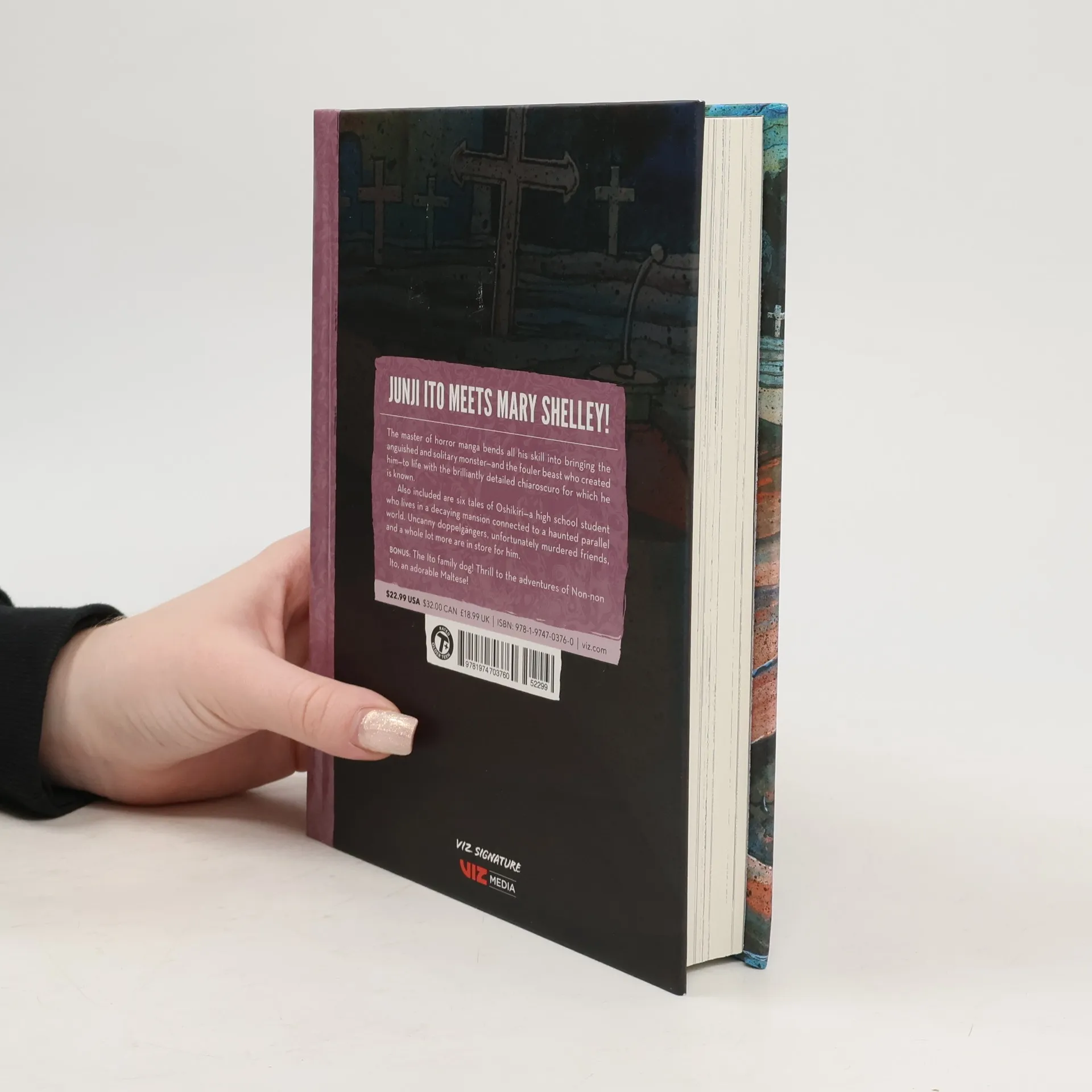 The master of horror manga brings the world's greatest horror novel—Frankenstein—back to life. Junji Ito meets Mary Shelley! The master of horror manga bends all his skill into bringing the anguished and solitary monster—and the fouler beast who created him—to life with the brilliantly detailed chiaroscuro he is known for. Also included are six tales of Oshikiri—a high school student who lives in a decaying mansion connected to a haunted parallel world. Uncanny doppelgangers, unfortunately murdered friends, and a whole lot more are in store for him. Bonus: The Ito family dog! Thrill to the adventures of Non-non Ito, an adorable Maltese!