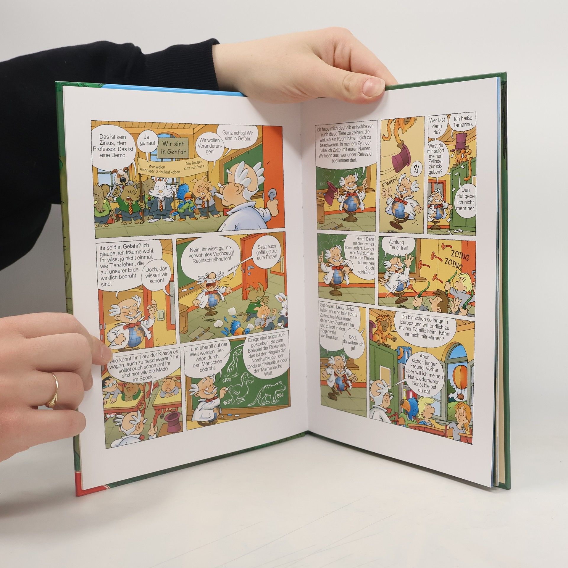 Gleich beim ersten Durchblättern besticht dieses Bilderbuch durch seine witzigen Zeichnungen! Die ersten Seiten führen mit einem kleinen Comic in die Geschichte ein, in der Professor Globe seine quirlige Schulklasse über die Natur und Umwelt unterrichtet. Mit einem Heißluftballon erkunden sie gemeinsam die aufregende Tierwelt Europas und Afrikas. Dabei erfahren sie eine Menge über die Tiere und deren Lebensraum und über die Gefahr, die vom Menschen für diese Tiere ausgeht. Natürlich erleben sie auf ihrer Reise auch so manches Abenteuer. Ein witziges, unterhaltsames und zugleich lehrreiches Bilderbuch
