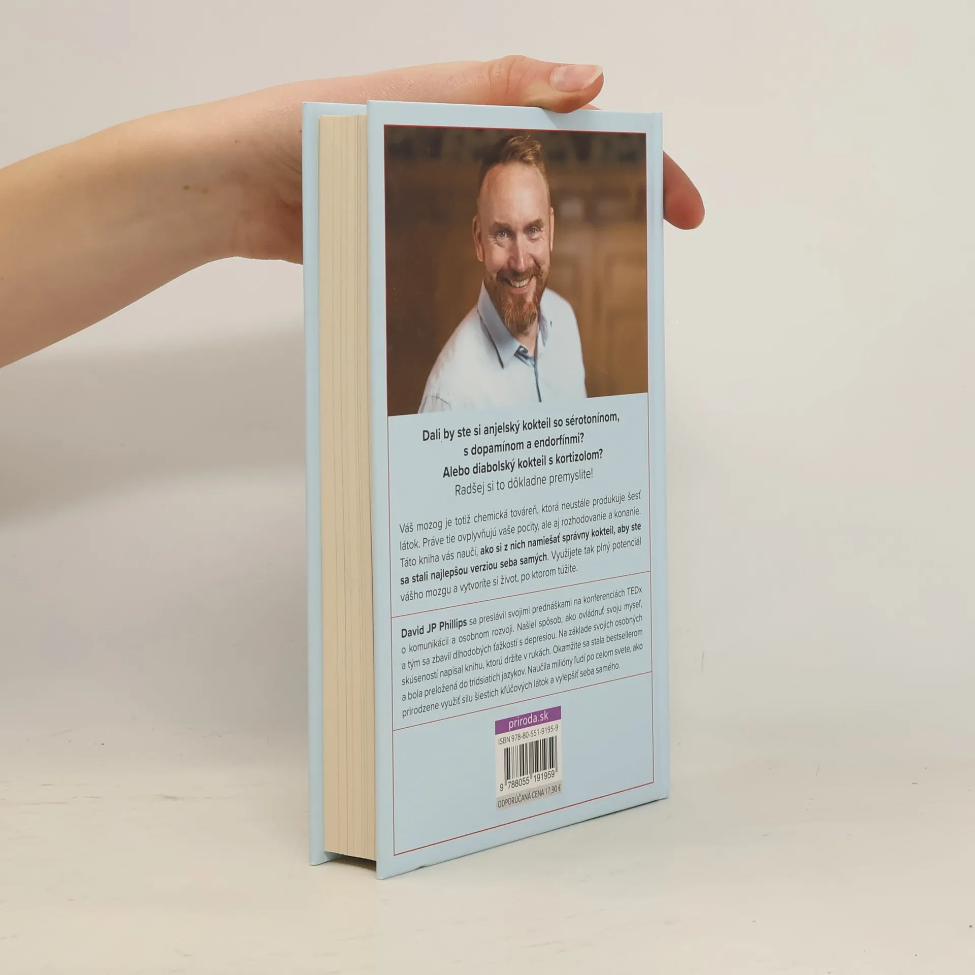 Dali by ste si anjelský kokteil so sérotonínom, s dopamínom a endorfínmi? Alebo diabolský kokteil s kortizolom? Radšej si to dôkladne premyslite! Váš mozog je totiž chemická továreň, ktorá neustále produkuje šesť látok. Práve tie ovplyvňujú vaše pocity, ale aj rozhodovanie a konanie. Táto kniha vás naučí, ako si z nich namiešať správny kokteil, aby ste sa stali najlepšou verziou seba samých. Využijete tak plný potenciál vášho mozgu a vytvoríte si život, po ktorom túžite. David JP Phillips sa preslávil svojimi prednáškami na konferenciách TEDx o komunikácii a osobnom rozvoji. Našiel spôsob, ako ovládnuť svoju myseľ, a tým sa zbavil dlhodobých ťažkostí s depresiou. Na základe svojich osobných skúseností napísal túto knihu, ktorá sa okamžite stala bestsellerom a bola preložená do tridsiatich jazykov. Naučila milióny ľudí po celom svete, ako prirodzene využiť silu šiestich kľúčových látok a vylepšiť seba samého.