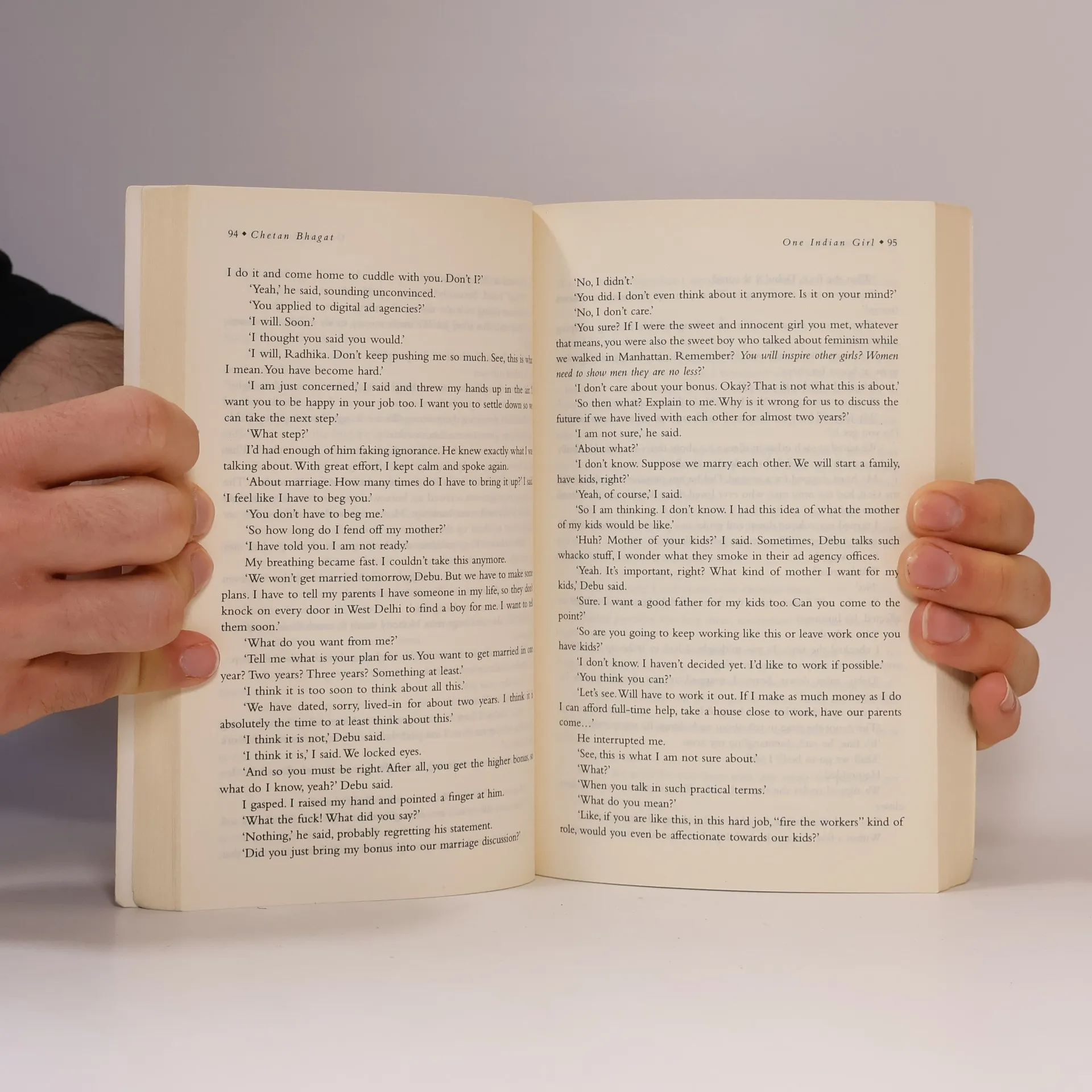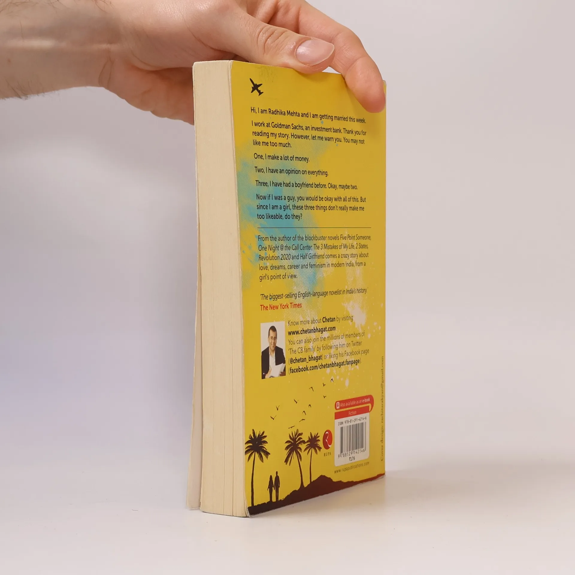 Hi, I'm Radhika Mehta and I'm getting married this week. I work at Goldman Sachs, an investment bank. Thank you for reading my story. However, let me warn you. You may not like me too much. One, I make a lot of money. Two, I have an opinion on everything. Three, I have had a boyfriend before. Ok, maybe two. Bestselling author Chetan Bhagat, writing for the first time in a female voice, brings to you One Indian Girl, the heart-warming story of a modern Indian girl. Now if all this was the case with a guy, one might be cool with it. But since I am a girl these three things I mentioned don't really make me too likeable, do they?--Page 4 of cover.