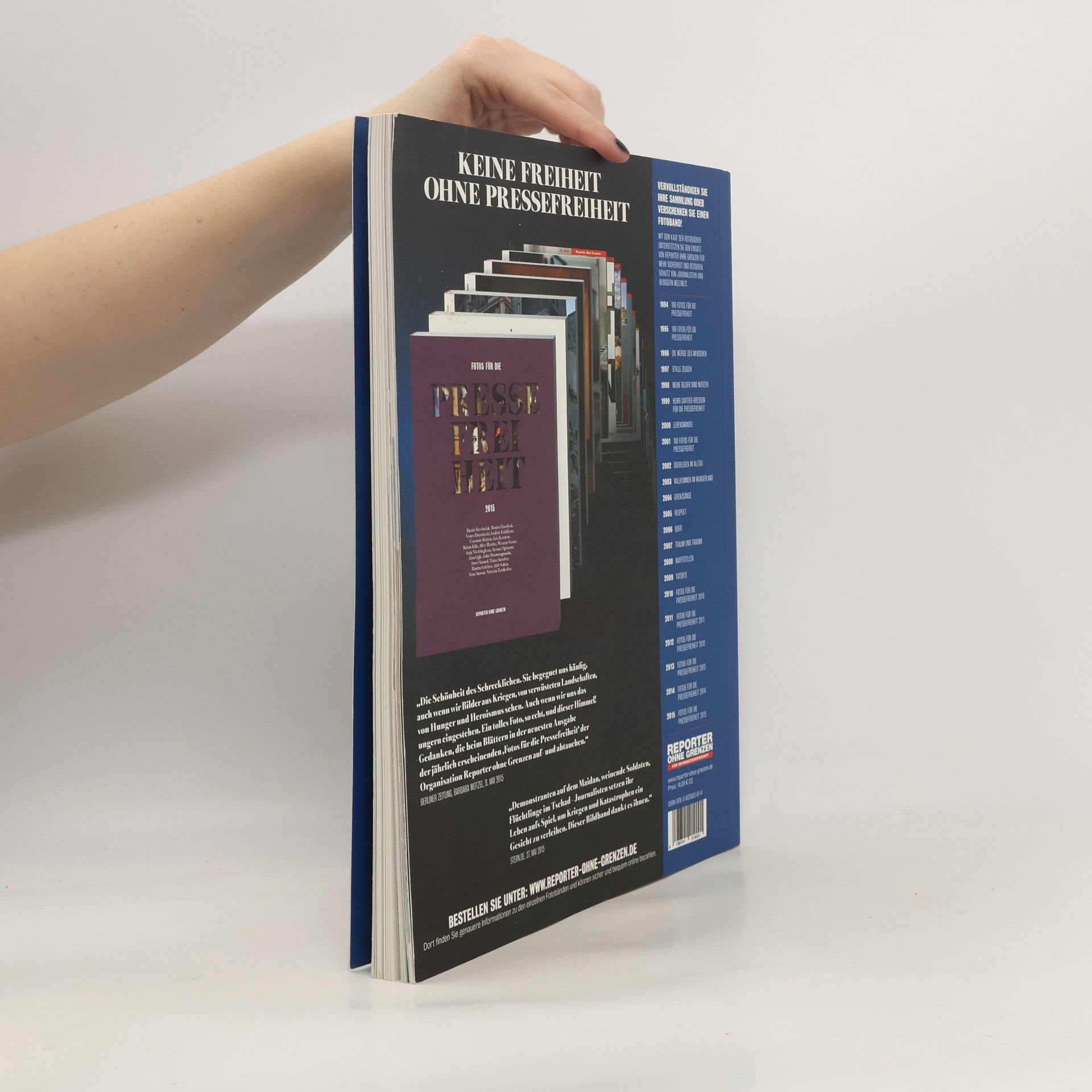 Das Buch „Fotos für die Pressefreiheit 2016“ dokumentiert die Ereignisse des vergangenen Jahres – vor allem in Staaten, in denen unabhängige Medien unter Druck stehen. Es wirft Schlaglichter auf die Brennpunkte des Nachrichtengeschehens und verbindet die Bilder international renommierter Fotografen mit Texten erfahrener Auslandskorrespondenten. Rund 18 Fotografen und 14 Autoren haben ihre Werke für das Fotobuch unentgeltlich zur Verfügung gestellt. Mit dem Verkauf der Bücher finanziert Reporter ohne Grenzen Öffentlichkeitsarbeit, Anwaltskosten und medizinische Hilfe für verfolgte Journalisten. Die Publikation ist im Rahmen des Deutschen Fotobuchpreises von einer Fachjury mit dem Prädikat „Nominiert 2015“ und „Nominiert 2016“ sowie 2010 mit dem kress Award für den besten Relaunch ausgezeichnet worden.