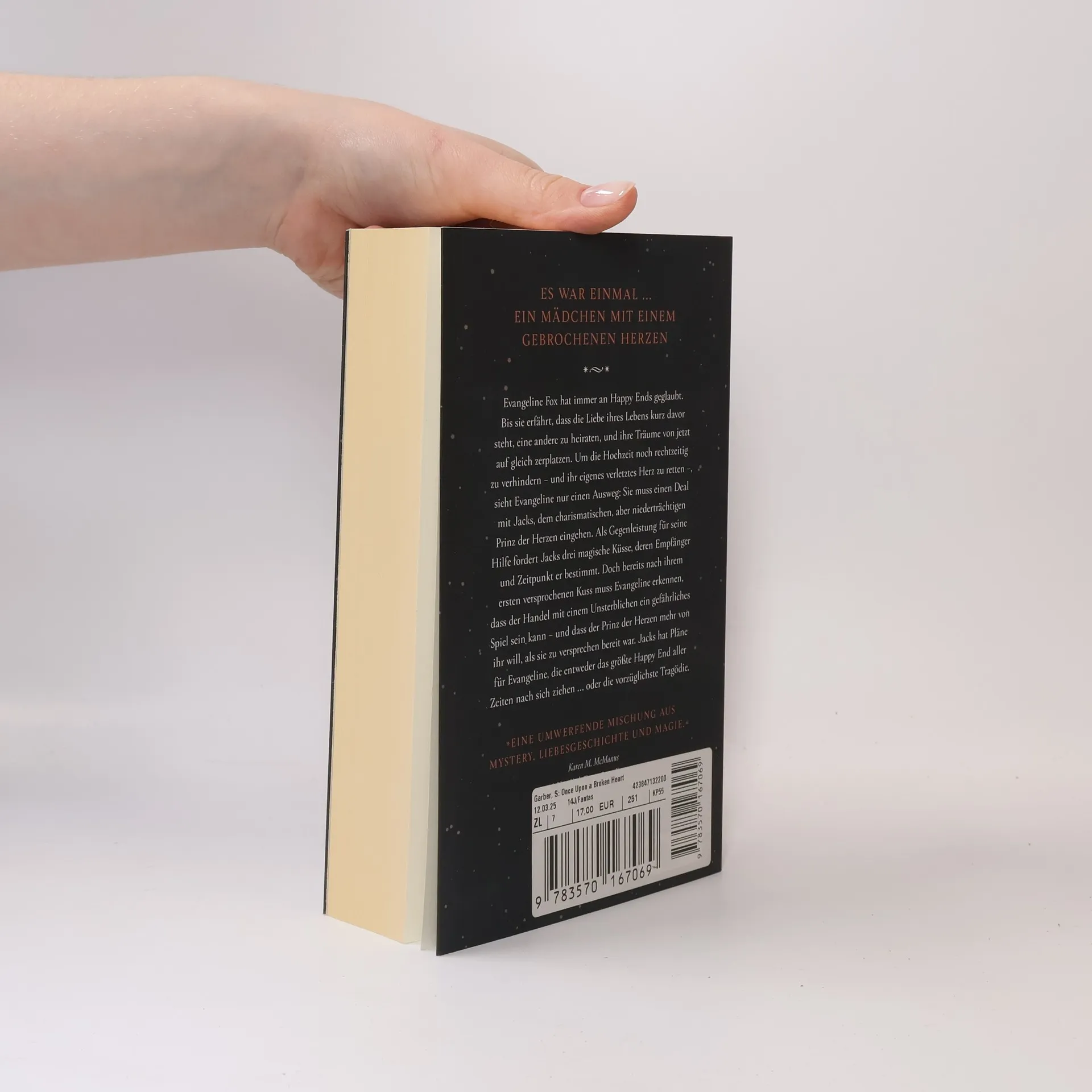 Es war einmal ... ein Mädchen mit einem gebrochenen Herzen Evangeline Fox hat immer an Happy Ends geglaubt. Bis sie erfährt, dass die Liebe ihres Lebens kurz davor steht, eine andere zu heiraten, und ihre Träume von jetzt auf gleich zerplatzen. Um die Hochzeit noch rechtzeitig zu verhindern – und ihr eigenes verletztes Herz zu retten –, sieht Evangeline nur einen Ausweg: Sie muss einen Deal mit Jacks, dem charismatischen, aber niederträchtigen Prinz der Herzen eingehen. Als Gegenleistung für seine Hilfe fordert Jacks drei magische Küsse, deren Empfänger und Zeitpunkt er bestimmt. Doch bereits nach ihrem ersten versprochenen Kuss muss Evangeline erkennen, dass der Handel mit einem Unsterblichen ein gefährliches Spiel sein kann – und dass der Prinz der Herzen mehr von ihr will, als sie zu versprechen bereit war. Jacks hat Pläne für Evangeline, die entweder das größte Happy End aller Zeiten nach sich ziehen … oder die vorzüglichste Tragödie.