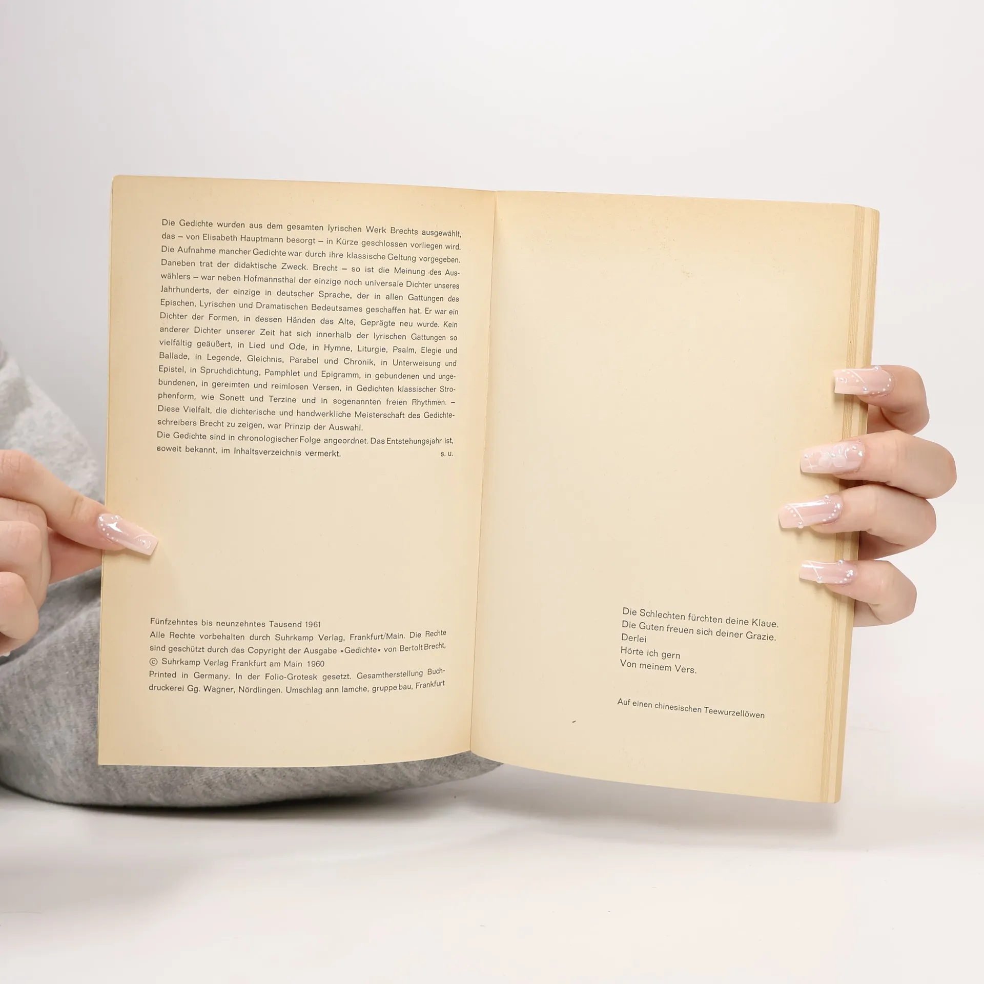Die Gesamtausgabe der Gedichte von Brecht umfasst sieben Bände und enthält 90 ausgewählte Gedichte aus über tausend. Sie zeigt Brechts Meisterschaft in verschiedenen lyrischen Formen, beginnend mit seinen frühen Gedichten aus dem Ersten Weltkrieg bis zu seinen letzten lyrischen Äußerungen.