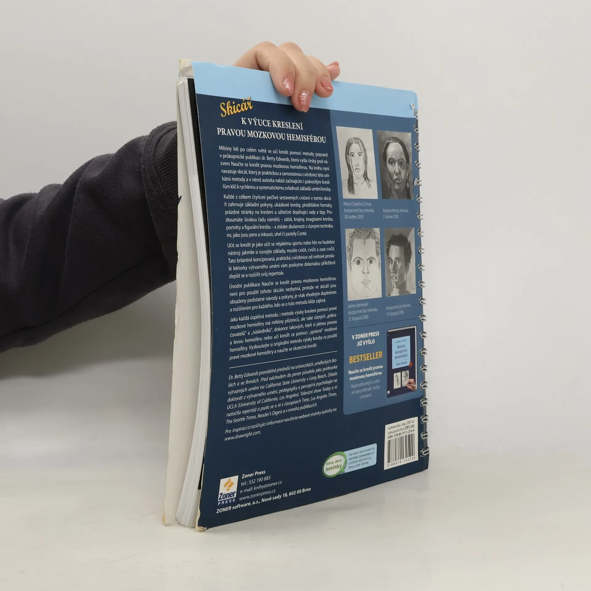 Cvičebnice, díky které začnete skutečně kreslit. Abyste se naučili kreslit, nestačí o tom jen číst knihy – musíte především trénovat a cvičit. A právě proto vznikl skicář Naučte se kreslit pravou hemisférou. I když perfektně doplňuje stejnojmennou knihu, která byla zaměřena spíše teoreticky, můžete jej zcela jistě použít i samostatně. Jedná se o soubor desítek úloh a cvičení, které vás provedou každou z pěti základních dovedností kreslení: vnímání hran, vnímání mezer (prostorů), vnímání vztahů, vnímání světel a stínů a vnímání celku. Kniha vám poskytne vše, co budete ke kreslení potřebovat, včetně naskenovaných fotografií a kreseb jiných autorů k obkreslování. Stačí vám základní kreslicí pomůcky jako tužka a guma a můžete se vydat na cestu k lepším kresbám. Pokud nemáte původní knihu od autorky Betty Edwards Naučte se kreslit pravou hemisférou, doporučujeme ji zakoupit spolu se skicářem, protože vám poskytne vysvětlení, proč které cvičení vlastně děláte, a rovněž vám podrobně vysvětlí sílu, která se ukrývá ve vaší kreativní pravé hemisféře – a také jak tuto sílu uvolnit. Kombinace obou knih je velmi silným nástrojem pro všechny, kteří se chtějí naučit kreslit nebo jen chtějí uvolnit svou kreativitu.