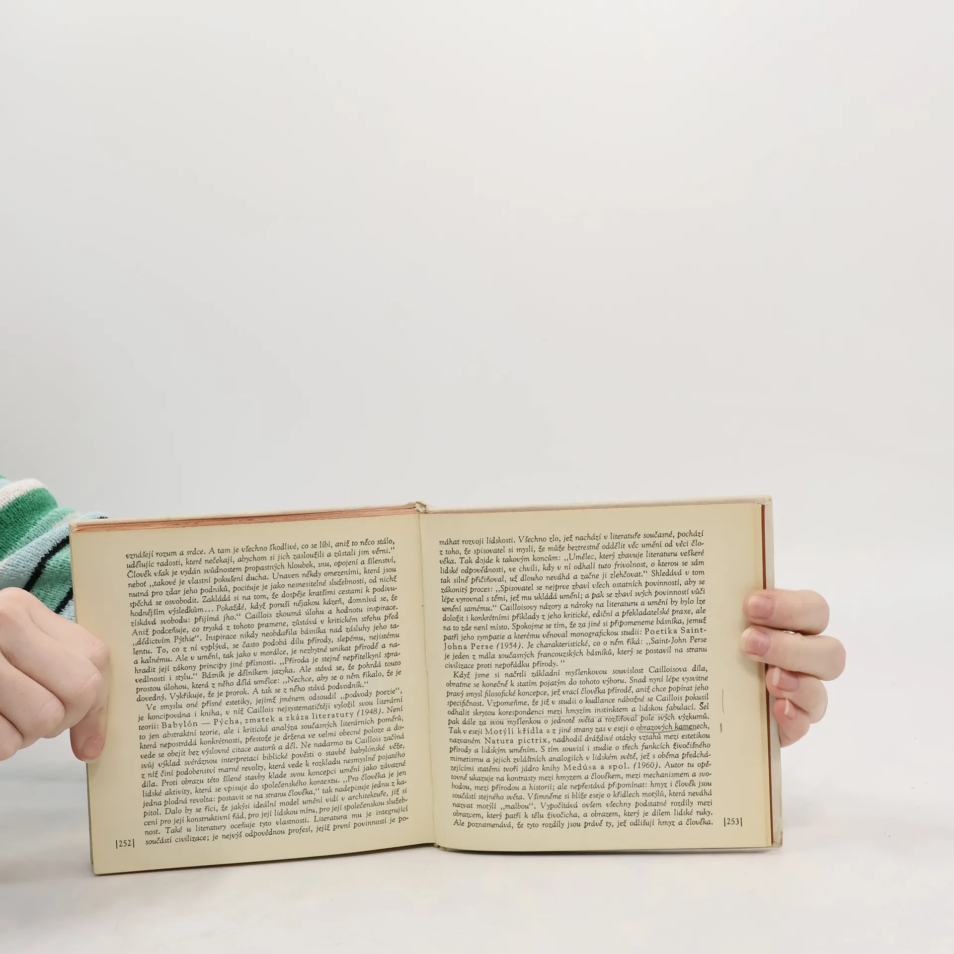 Autor, původně sociolog, zasahuje svými pracemi nejen do sociologie, etnologie, historie, psychologie, filosofie, estetiky, literární teorie a kritiky, ale i do zoologie, botaniky a mineralogie. Nalézá, spojuje vědu s uměním a překračuje hranice poznání rozdrobeného přílišnou specializací, souvislosti, jež specialistovi unikají. Výbor z jeho díla obsáhl spisy Mýtus a člověk, Medúsa a spol. a Zobecněná estetika. V prvním formuloval ortodoxně své vědecké krédo, v druhém ukazoval na kontrasty mezi hmyzem a člověkem, mezi mechanismem a svobodou, mezi přírodou a historií, v třetím zobecnil a systemizoval své myšlenky, hlavně pak dovozoval, že estetické představy a umělecká díla koneckonců odpovídají kosmologickým zákonitostem.Z francouzských originálů připravil Miroslav Míčko, který také vybral obrazovou přílohu a napsal ediční poznámku a doslov Člověk v přírodě a příroda v člověku; přeložili Stanislav Jirsa a Miroslav Míčko; fotografie Karel Kuklík a kol.