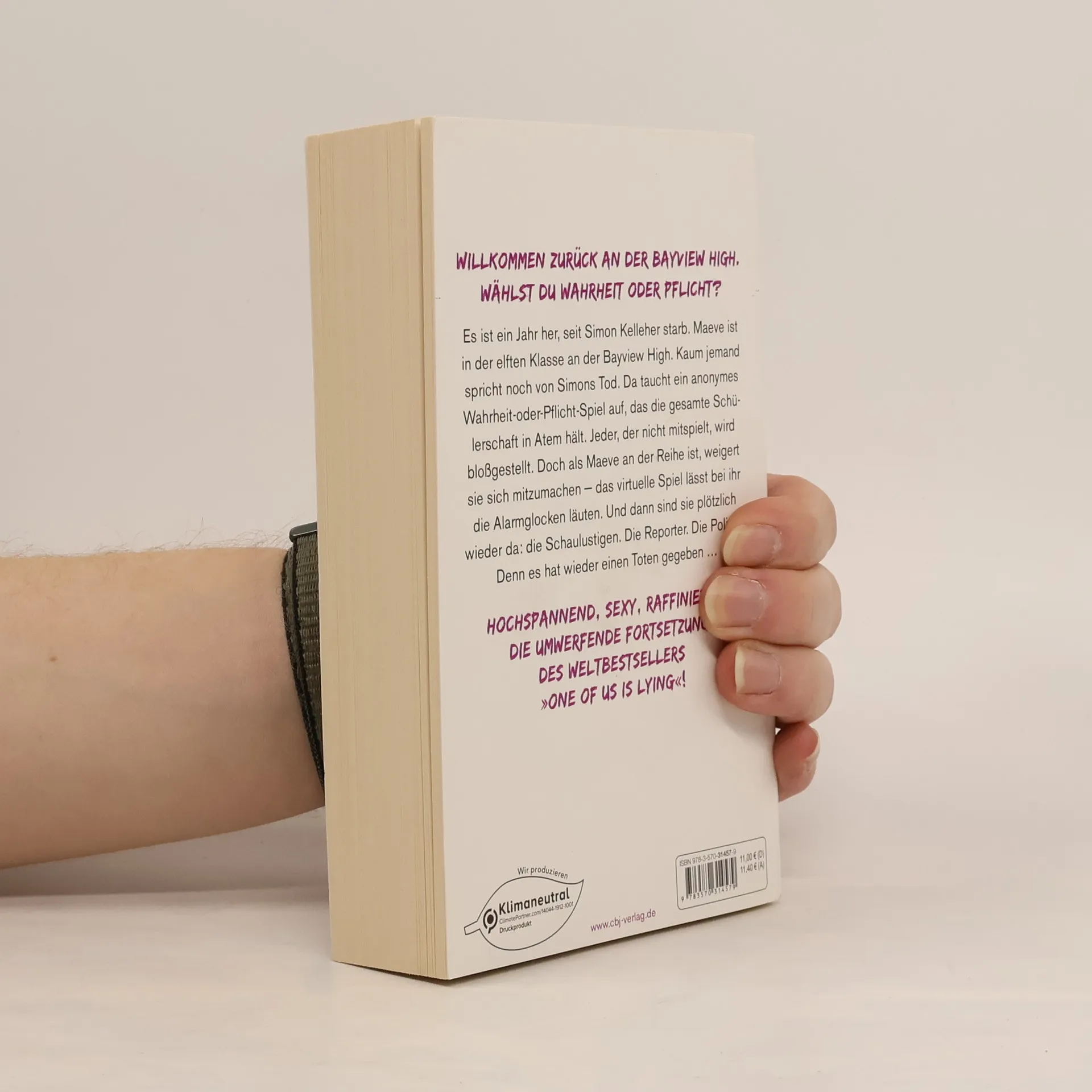 Willkommen zurück an der Bayview High. Gib's zu. Du hast es vermisst. Es ist ein Jahr her, seit Simon Kelleher starb. Maeve ist in der elften Klasse an der Bayview High. Über Simons Tod und dessen Folgen wird kaum mehr geredet. Da taucht ein anonymes Wahrheit-oder-Pflicht-Spiel auf, das die gesamte Schülerschaft in Atem hält. Jeder, der nicht mitspielt, wird bloßgestellt. Doch als Maeve an der Reihe ist, weigert sie sich, mitzumachen — das virtuelle Spiel, ausgerichtet von »DarkestMind«, lässt bei ihr alle Alarmglocken läuten. Und dann sind sie plötzlich wieder da: die Schaulustigen. Die Reporter. Die Polizei. Denn es hat wieder einen Toten gegeben … Die furiose Fortsetzung des Weltbestsellers »One of us is lying« – hochspannend, sexy, raffiniert. Karen M. McManus bei cbj & cbt: One Of Us Is Lying Two Can Keep A Secret One Of Us Is Next The Cousins You will be the death of me Nothing more to tell One of us is back Alle Bücher können unabhängig voneinander gelesen werden.
