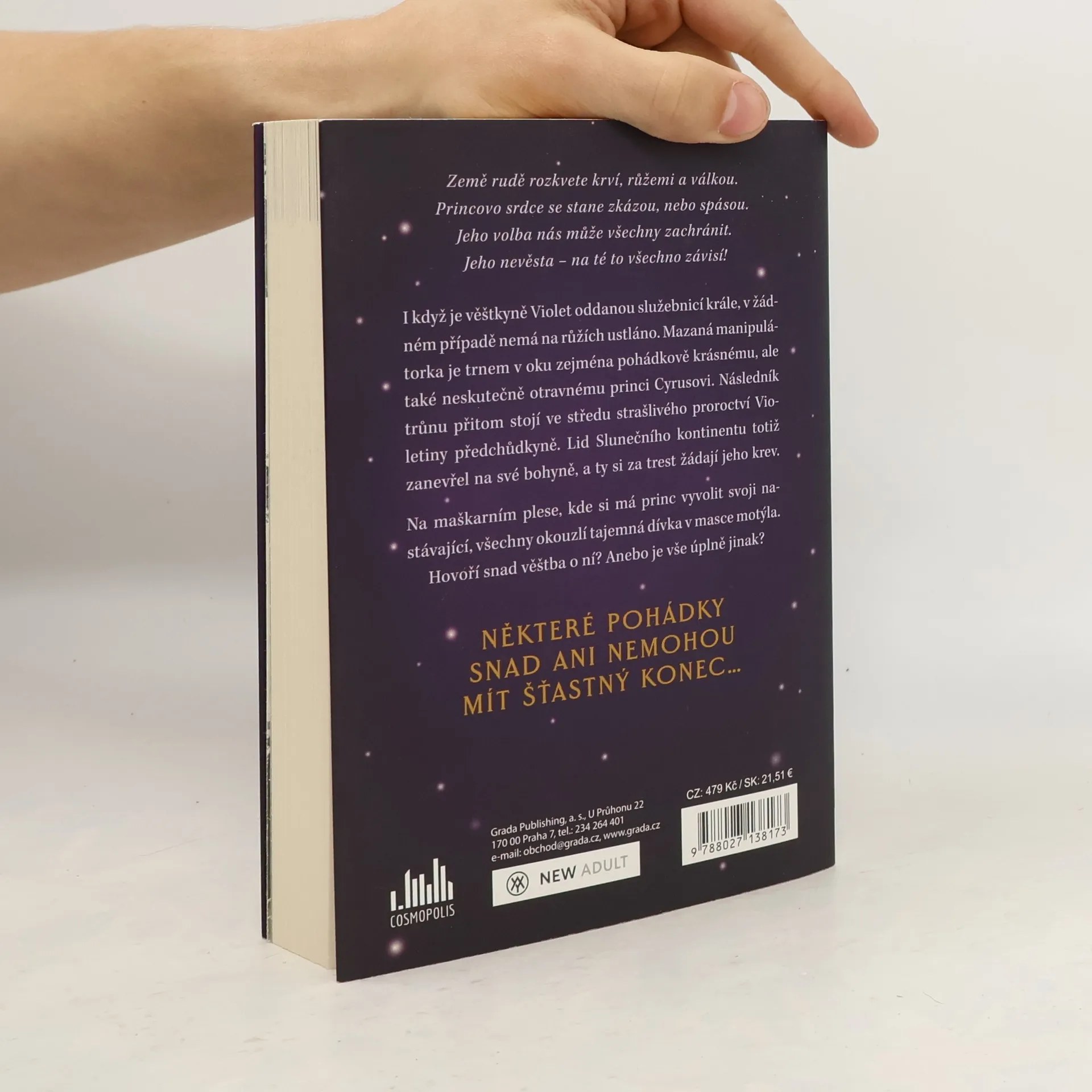 Země rudě rozkvete krví, růžemi a válkou. Princovo srdce se stane zkázou, nebo spásou. Jeho volba nás může všechny zachránit. Jeho nevěsta – na té to všechno závisí! I když je věštkyně Violet oddanou služebnicí krále, v žádném případě nemá na růžích ustláno. Mazaná manipulátorka je trnem v oku zejména pohádkově krásnému, ale také neskutečně otravnému princi Cyrusovi. Následník trůnu přitom stojí ve středu strašlivého proroctví Violetiny předchůdkyně. Lid Slunečního kontinentu totiž zanevřel na své bohyně, a ty si za trest žádají jeho krev. Na maškarním plese, kde si má princ vyvolit svoji nastávající, všechny okouzlí tajemná dívka v masce motýla. Hovoří snad věštba o ní? Anebo je vše úplně jinak? NEKTERÉ POHÁDKY SNAD ANI NEMOHOU MÍT ŠŤASTNÝ KONEC