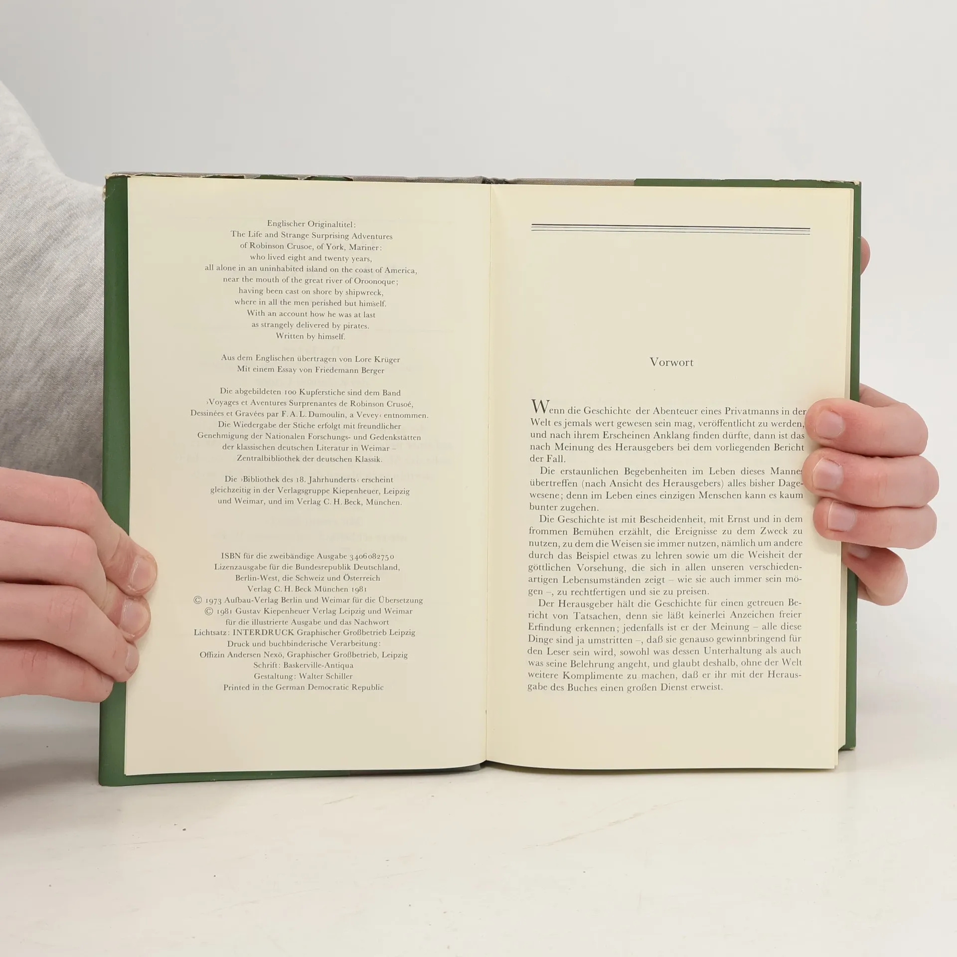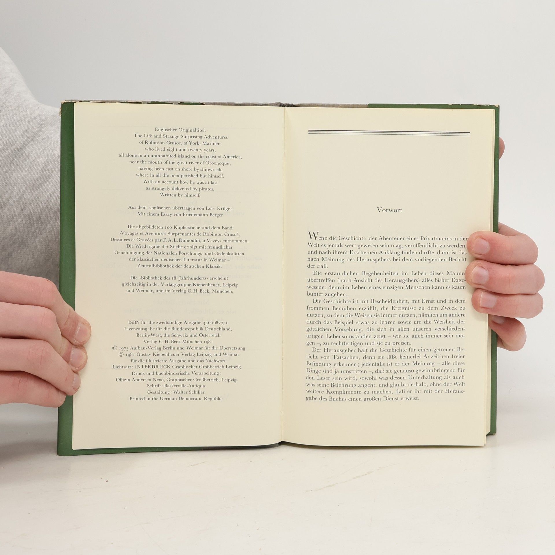 »Das Leben und die seltsamen Abenteuer des Robinson Crusoe, eines Seemanns aus York. Welcher achtundzwanzig Jahre ganz allein auf einer unbewohnten Insel vor der amerikanischen Küste, nahe der Mündung des großen Orinoco lebte, wohin er nach einem Schiffbruch, bei dem die ganze Besatzung außer ihm selbst ums Leben kam, verschlagen wurde. Nebst dem Bericht wie er auf wundersame Weise durch Piraten gerettet wurde. Geschrieben von ihm selbst.« So lautet der volle Titel des Buches, dessen wichtigste Begebenheiten hier in Auswahl dargeboten werden. Gekürzte Ausgabe