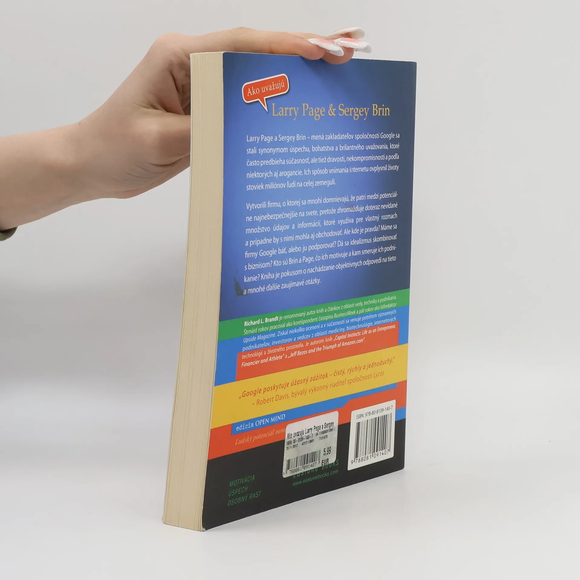 Mená zakladateľov Google sa stali synonymom úspechu, bohatstva a brilantného uvažovania, no podľa niektorých aj dravosti arogancie. Máme sa firmy Google báť, alebo ju podporovať? Kto sú Brin a Page, čo ich motivuje a kam smeruje ich podnikanie? Kniha sa snaží odpovedať na tieto a mnohé ďalšie zaujímavé otázky.