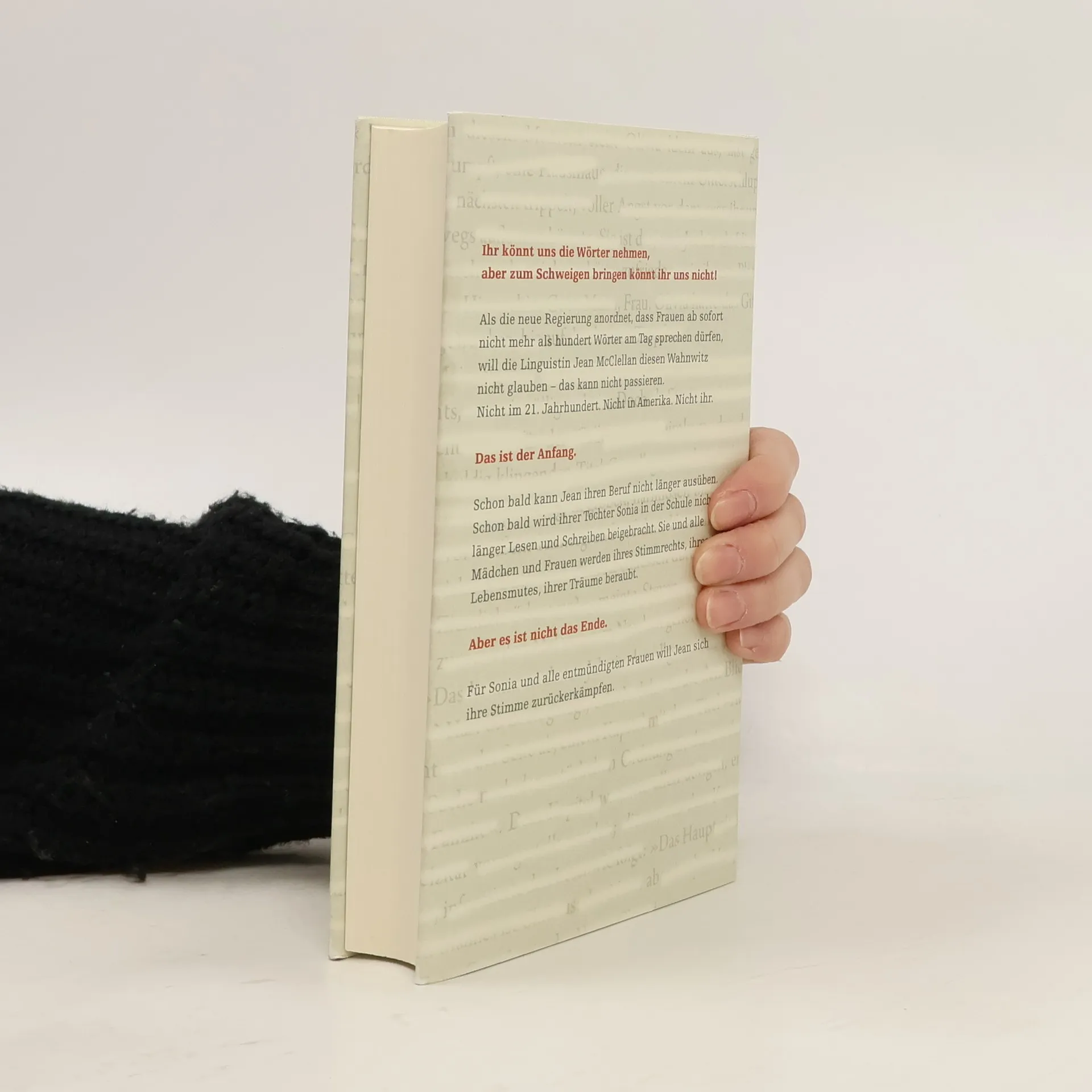 Eine christlich-fundamentalistische Regierungsbewegung verbietet allen Frauen, mehr als hundert Wörter täglich zu sprechen. Das Verbot, dem weitere Repressionen folgen, beschneidet fundamentale Rechte von Mädchen und Frauen und erschüttert die Grundfesten ihrer Existenz. Die Neurolinguistin Jean McClellan muss infolgedessen ihren Beruf aufgeben und ihrer Tochter Sonia wird in der Schule nicht länger Lesen und Schreiben beigebracht. Daher rebelliert sie. Für sich, für ihre Tochter und für alle entmündigten Frauen. Eine Dystopie des 21. Jahrhunderts und ein Thriller, der von der Unterdrückung von Sprache handelt.