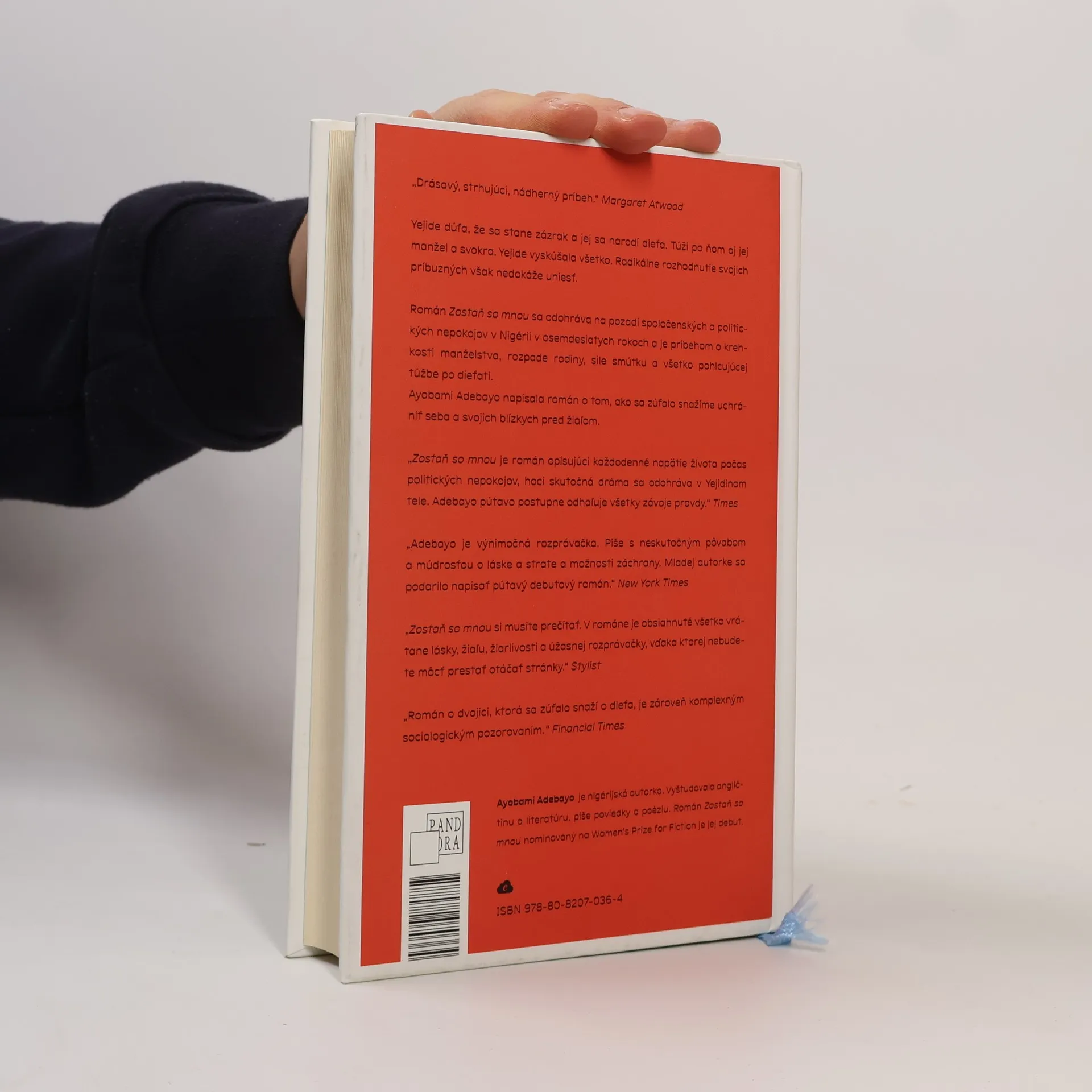 Yejide dúfa, že sa stane zázrak a jej sa narodí dieťa. Túži po ňom aj jej manžel a svokra. Yejide vyskúšala všetko. Radikálne rozhodnutie svojich príbuzných však nedokáže uniesť. Román Zostaň so mnou sa odohráva na pozadí spoločenských a politických nepokojov v Nigérii v osemdesiatych rokoch a je príbehom o krehkosti manželstva, rozpade rodiny, sile smútku a všetko pohlcujúcej túžbe po dieťati. Ayobami Adebayo napísala román o tom, ako sa zúfalo a niekedy ničivo snažíme uchrániť seba a svojich blízkych pred žiaľom. Ayóbámi Adébáyò je nigérijská autorka. Vyštudovala angličtinu a literatúru, píše poviedky a poéziu. Román Zostaň so mnou nominovaný na Women’s Prize for Fiction je jej debut.