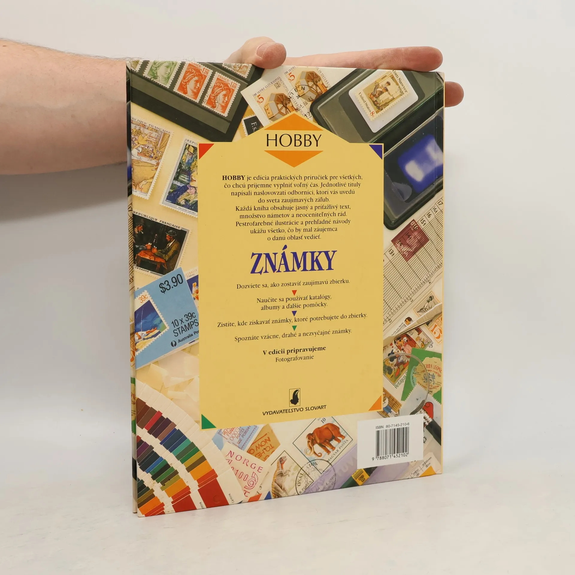Dozviete sa, ako zostaviť zaujímavú zbierku, naučíte sa používať katalógy, albumy a ďalšie pomôcky, zistíte, kde získavať známky, ktoré potrebujete do zbierky, spoznáte vzácne, drahé a nezvyčajné známky. Kapitoly: Zbieranie známok, Ako získavať známky, Albumy, Pomôcky, Starostlivosť o známky, Rozmiestňovanie známok, Katalógy, Druhy známok, Vzácne známky, Nezvyčajné známky, Teritoriálne zbierky, Námetové zbierky, Rozmanitosť námetu, Výroba známok, Falšovanie a falzifikáty, Chyby, Pošta v minulosti, Letecká pošta, Nezvyčajná poštová preprava, Obálky prvého dňa vydania, Poštové pečiatky, Pretlače, Popolušky, Kluby filatelistov, Cudzie abecedy, Mapy známkových krajín.