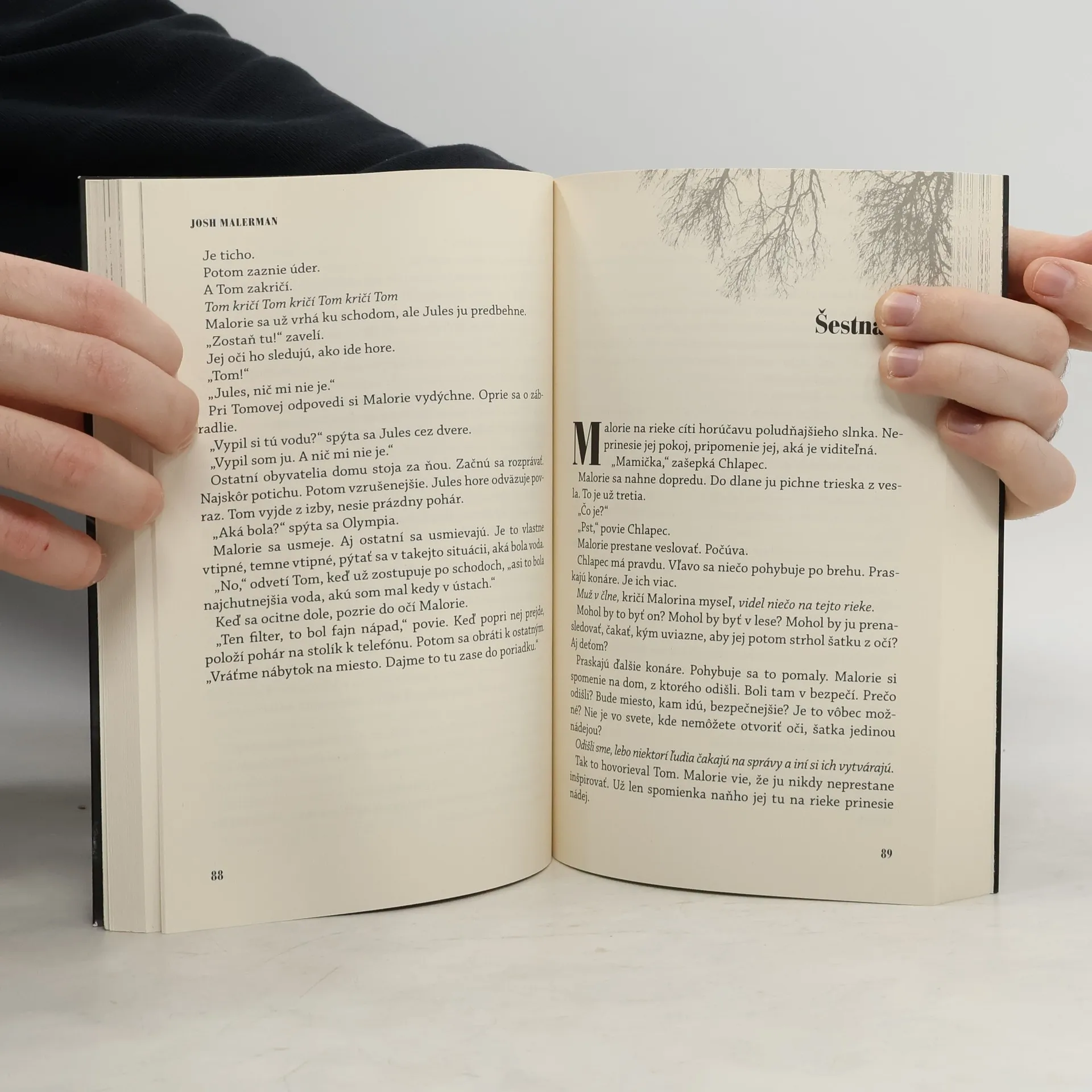Vonku niečo je... Je to desivé a vražedné. Nikto nevie, čo to je, ale ak sa na to človek len raz pozrie, neznáma sila ho prinúti k brutálnemu násiliu. Odkiaľ to prišlo? Ako to zahnať? Päť rokov po tom, ako sa to začalo, zostáva nažive len kde-tu hŕstka ľudí. Malorie a jejdve malé deti bývajú v opustenom dome pri rieke a ona sníva, že s nimi utečie na miesto, kde nájdu bezpečie. Ale toho úteku sa bojí: bude to tridsaťkilometrová plavba po rieke v člne so zaviazanými očami. Jediné zlé rozhodnutie môže zahubiť ju aj deti. A navyše ich niekto sleduje. Je to človek, zviera alebo monštrum? Malorie, obklopená tmou a známymi aj neznámymi zvukmi, sa vydáva na mučivú odyseu – do neznáma, do minulosti, do spomienok na ľudí, ktorí boli jej záchrancami. Ohromujúci debutový román Josha Malermana zobrazuje svet, v akom by ste nechceli žiť, ale prečítate si o ňom so zatajeným dychom.