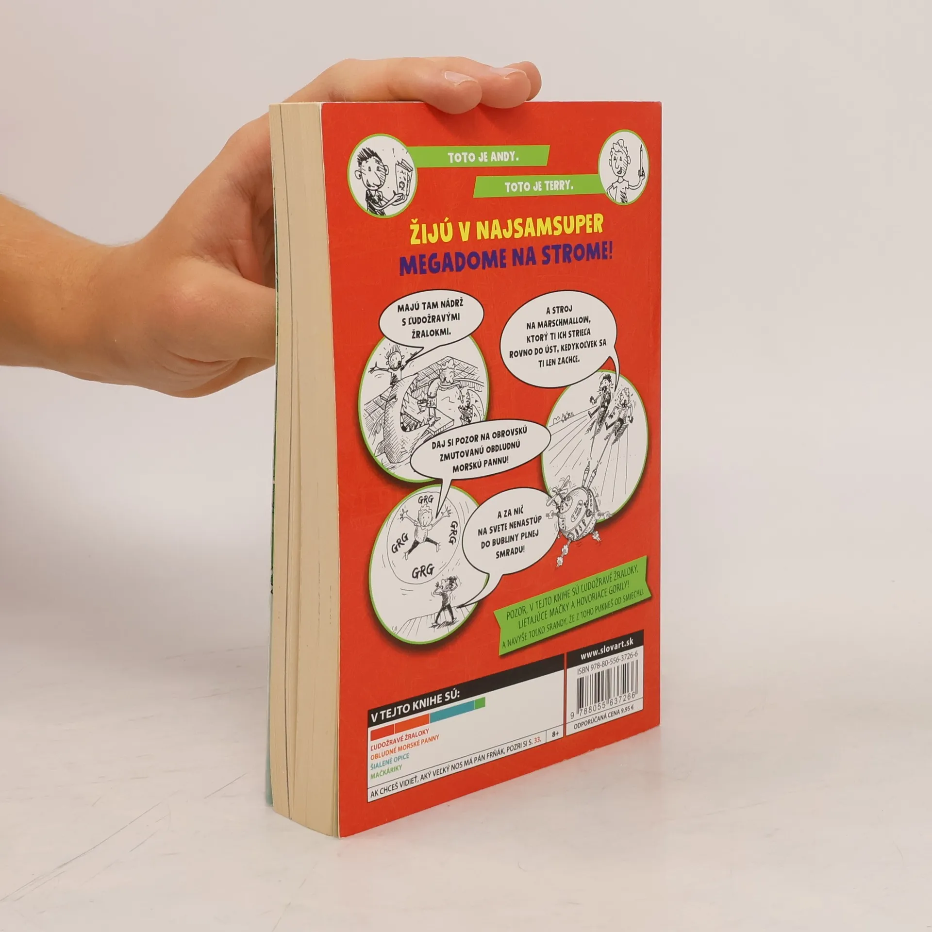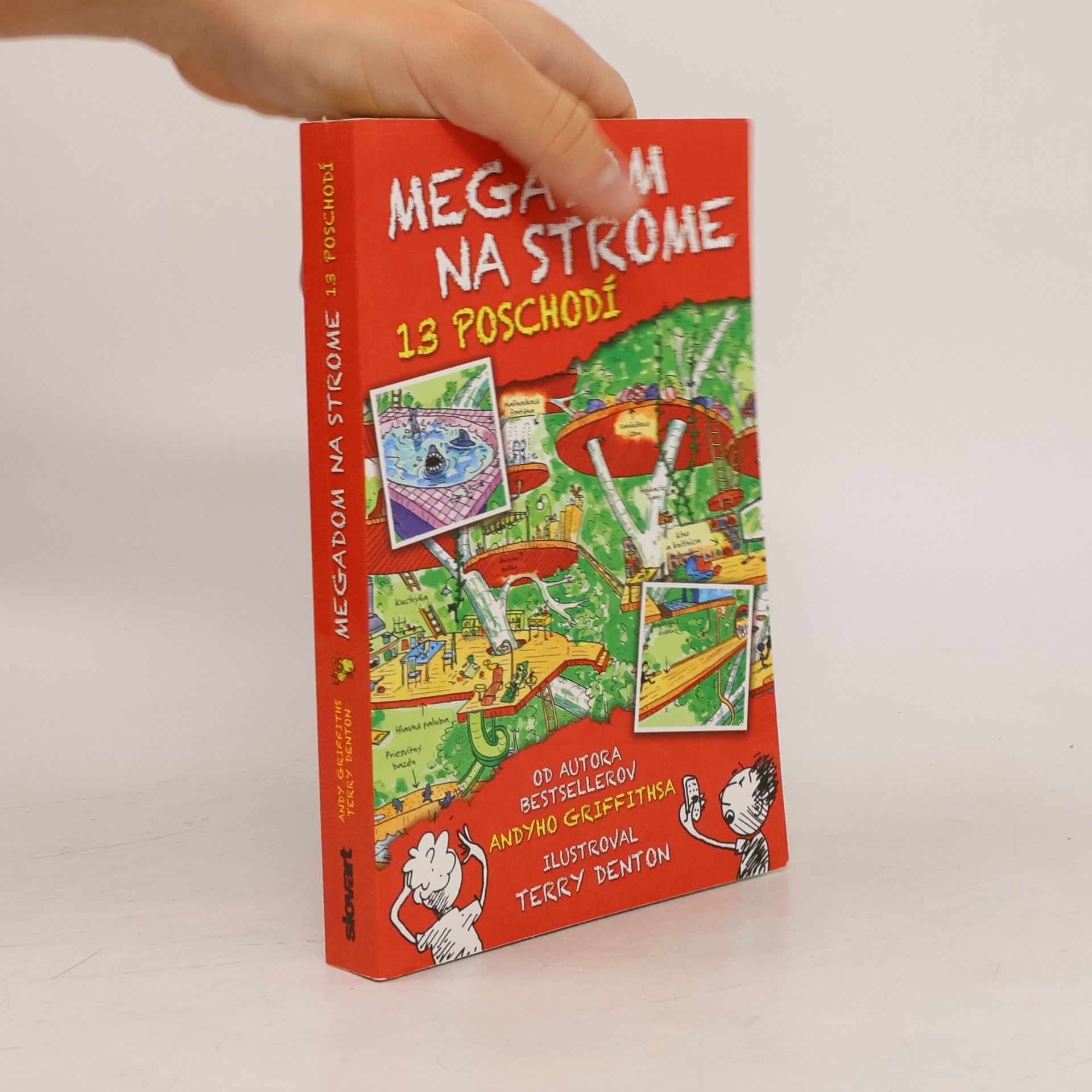 Nová séria Megadom na strome pobaví malých i veľkých. Veď kto by už nechcel mať domček na strome? A nie obyčajný! Megadom, čo má 13 poschodí, bowlingovú dráhu, priesvitný bazén, nádrž s ľudožravými žralokmi, tajné podzemné laboratórium, herňu, liany, na ktorých sa môžete hojdať, stroj na penové cukríky, ktorý vám ich triafa rovno do úst... Uznajte, že v takom prípade sa nedá veľmi sústrediť na písanie ani ilustrovanie kníh. Lenže čo majú spraviť Andy a Terry, spisovateľ a ilustrátor, ktorí v tomto megadome na strome bývajú. A to riaditeľovi vydavateľstva sľúbili, že zajtra o piatej odovzdajú hotovú knihu. Koľko z nej už majú? No hádajte! Ani čiarku!