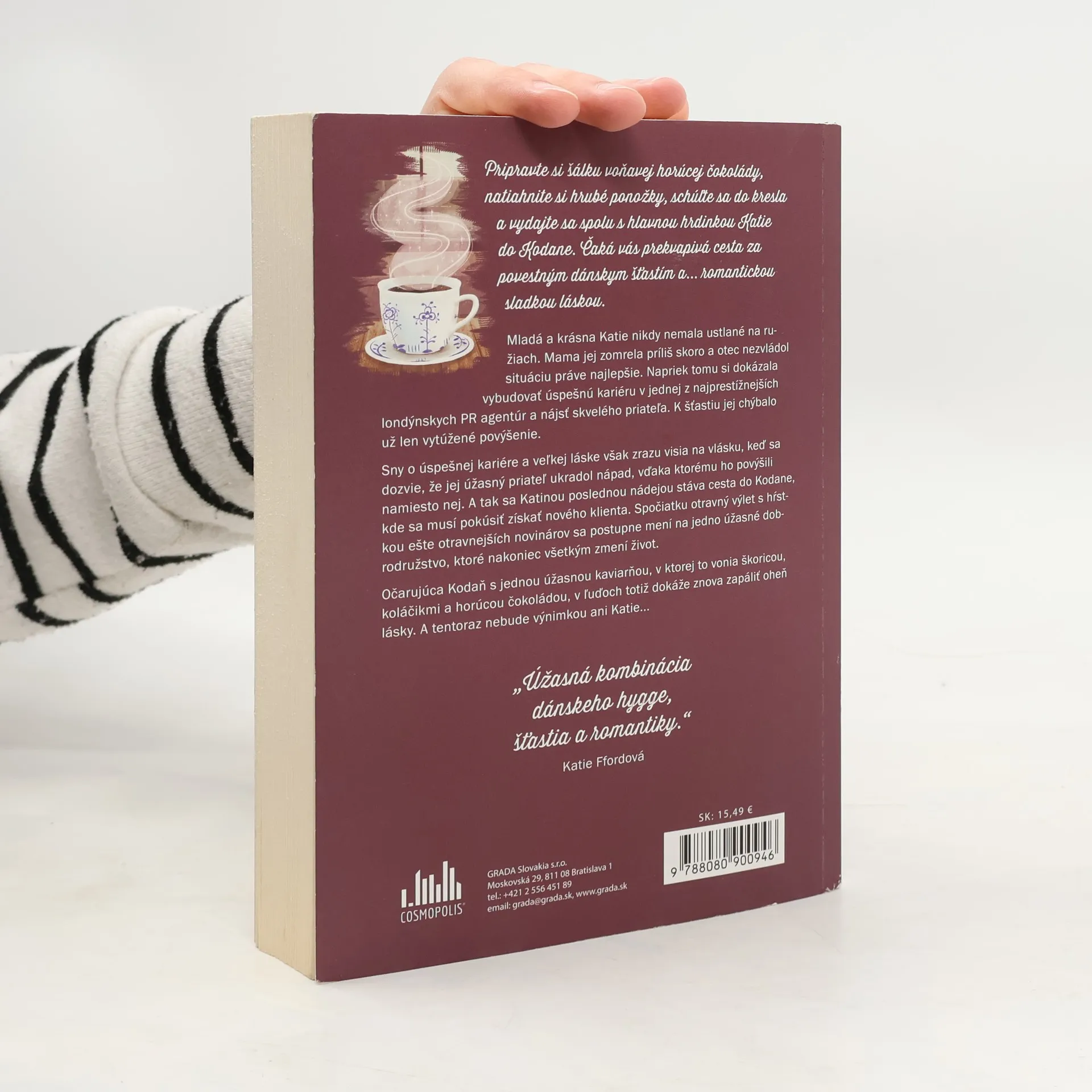 Pripravte si šálku voňavej horúcej čokolády, natiahnite si hrubé ponožky, schúľte sa do kresla a vydajte sa spolu s hlavnou hrdinkou Katie do Kodane. Čaká vás prekvapivá cesta za povestným dánskym šťastím a. .. romantickou sladkou láskou. Mladá a krásna Katie nikdy nemala ustlané na ružiach. Mama jej zomrela príliš skoro a otec nezvládol situáciu práve najlepšie. Napriek tomu si dokázala vybudovať úspešnú kariéru v jednej z najprestížnejších londýnskych PR agentúr a nájsť skvelého priateľa. K šťastiu jej chýbalo už len vytúžené povýšenie. Sny o úspešnej kariére a veľkej láske však zrazu visia na vlásku, keď sa dozvie, že jej úžasný priateľ ukradol nápad, vďaka ktorému ho povýšili namiesto nej. A tak sa Katinou poslednou nádejou stáva cesta do Kodane, kde sa musí pokúsiť získať nového klienta. Spočiatku otravný výlet s hŕstkou ešte otravnejších novinárov sa postupne mení na jedno úžasne dobrodružstvo, ktoré nakoniec všetkým zmení život. Očarujúca Kodaň s jednou úžasnou kaviarňou, v ktorej to vonia škoricou, koláčikmi a horúcou čokoládou, v ľuďoch totiž dokáže znova zapáliť oheň lásky. A tentoraz nebude výnimkou ani Katie. ..