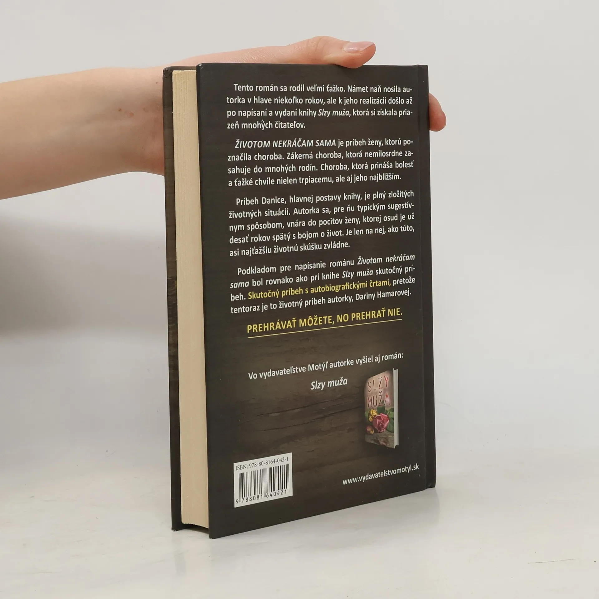 Príbeh Danice, hlavnej postavy knihy, je plný zložitých životných situácií. Autorka sa, pre ňu typickým sugestívnym spôsobom, vnára do pocitov ženy, ktorej osud je už desať rokov spätý s bojom o život. Je len na nej, ako túto, asi najťažšiu životnú skúšku zvládne. Podkladom pre napísanie románu Životom nekráčam sama bol rovnako ako pri knihe Slzy muža skutočný príbeh. Skutočný príbeh s autobiografickými črtami, pretože tentoraz je to životný príbeh autorky, Dariny Hamarovej.