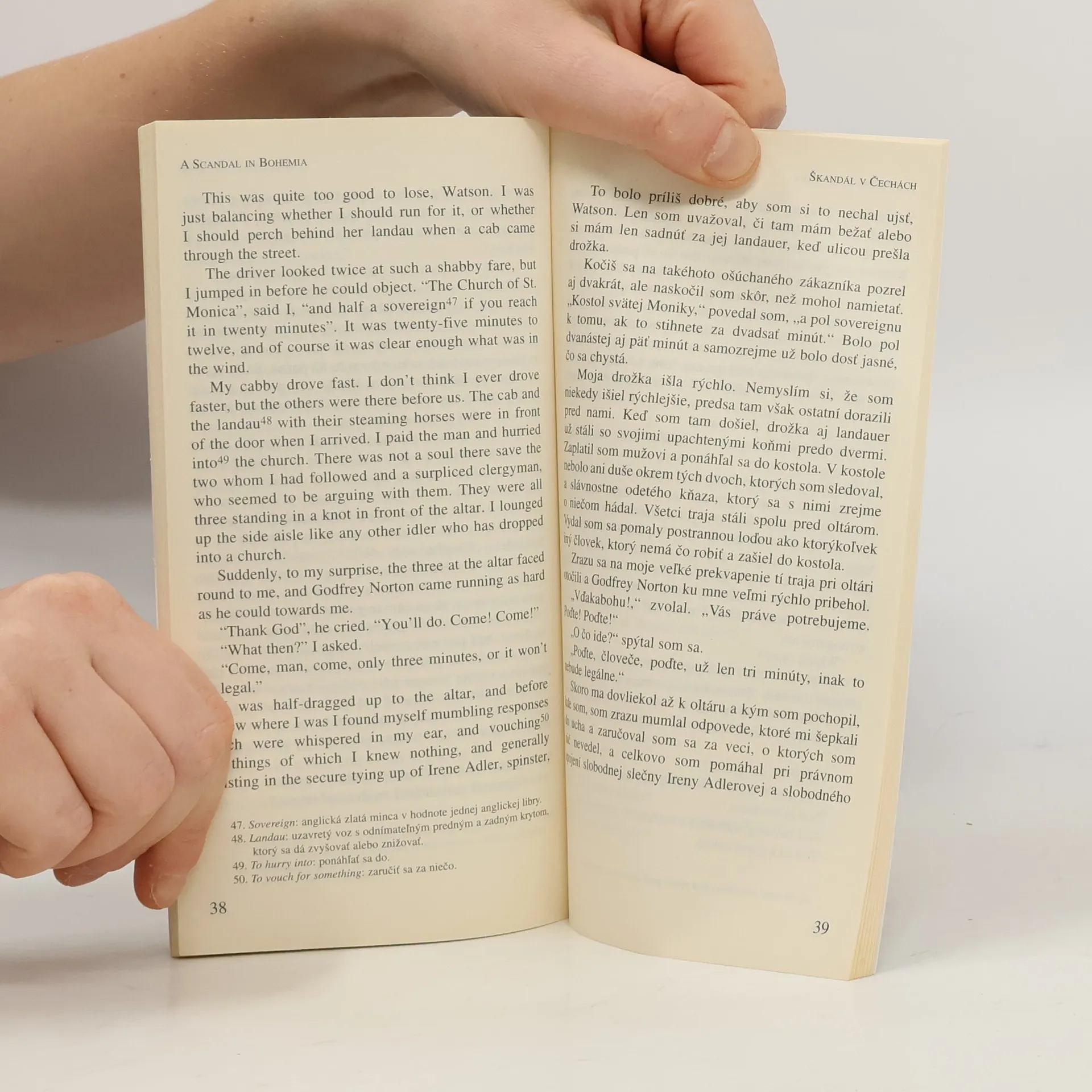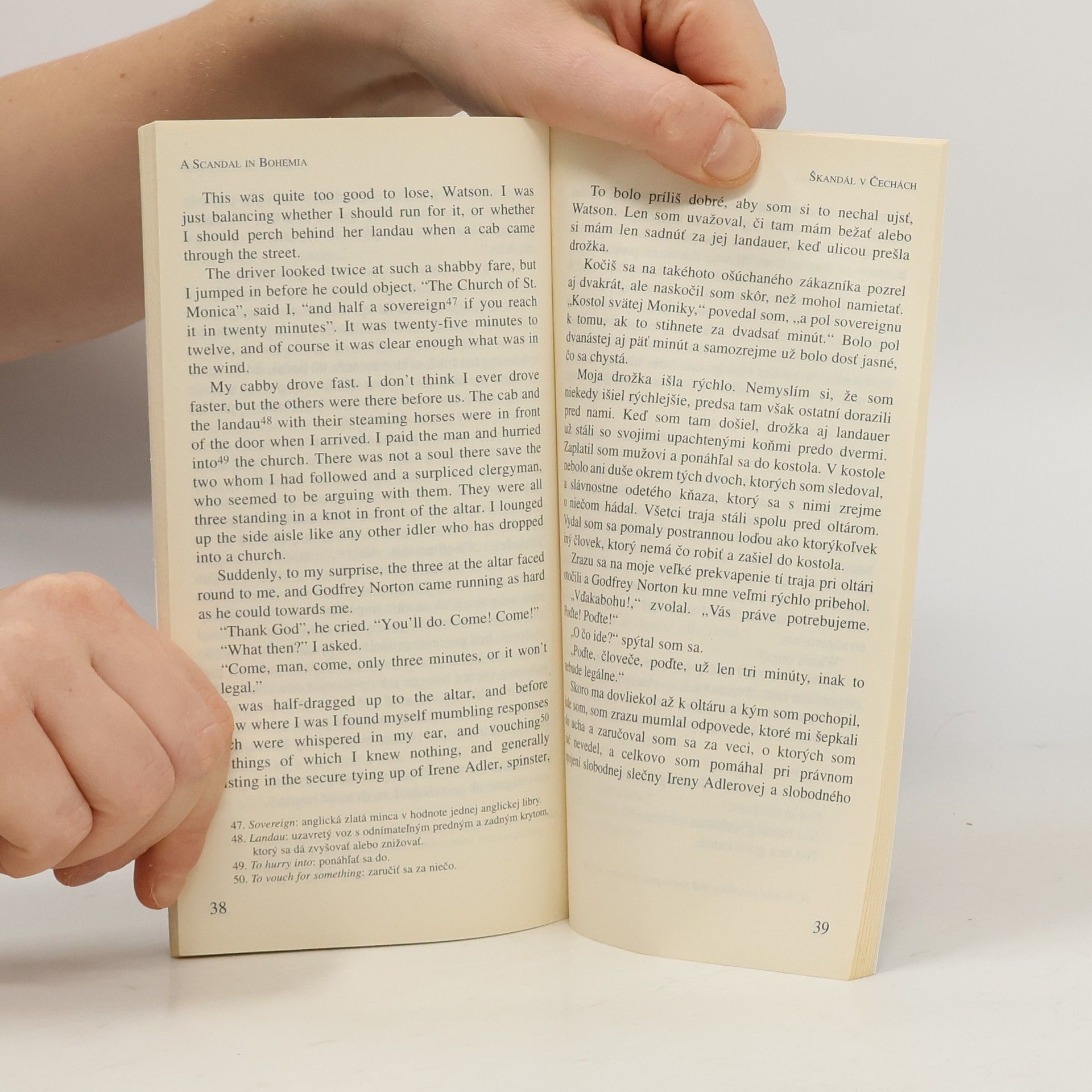Druhá seria - kniha č. 1 Dvojjazyčná kniha - denník Nový Čas Holmesovský příběh, který samozřejmě upoutá pozornost českého čtenáře svým zeměpisným určením. Leč je třeba ho hned naúvod zklamat: Čechy zde nepředstavují zemi Rakousko-Uherského mocnářství, ale jakýsi pohádkový útvar. Už jen proto, že žádný český král tehdy nepanoval. Nicméně příběh o milostném příběhu panovníka a prohnané Ireně Adlerové je napínavý a zajímavý už jen proto, že A.C. Doyle byl znám svým rezervovaným postojem k ženám s jedinou výjimkou, kterou byla právě zpěvačka Irenau Adlerová ze Skandálu v Čechách.
