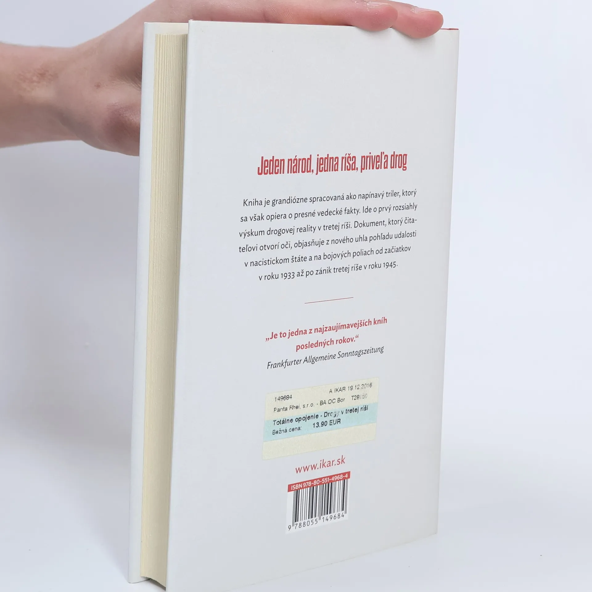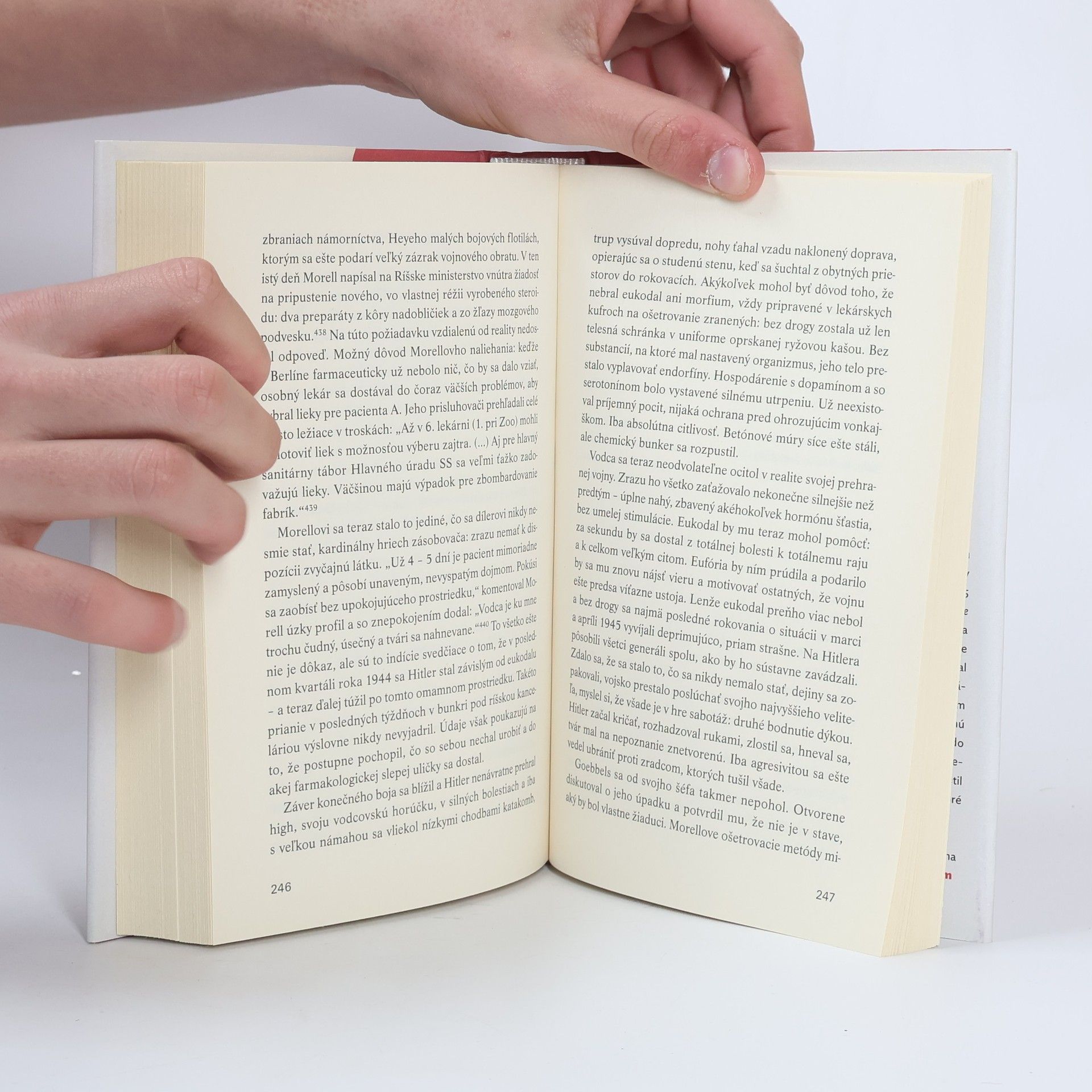 Objavný pohľad na neznáme fakty o užívaní drog v tretej ríši Áno, naozaj nejde o omyl. Napriek tomu, že boli oficiálne zakázané, drogy sa v tretej ríši vyrábali a konzumovali skutočne vo veľkom. Prvotným cieľom bolo zvýšiť odolnosť a výdrž nemeckých vojakov na bojových poliach. Omamné látky však obľubovali aj najvyšší predstavitelia ríše. Nemeckí chemici preto vykonávali pokusy s metamfetamínom, neskôr sa prešlo k masovej výrobe pervitínu. Prvý raz ho nemeckí velitelia „úspešne“ vyskúšali pri obsadzovaní Poľska, a keď Nemecko v roku 1940 napadlo Francúzsko, vojaci Wehrmachtu boli pod vplyvom 35 miliónov dávok pervitínu! Ba aj údajný abstinent, nefajčiar a vyznávač zdravého životného štýlu Hitler rád siahol po farmakologickej stimulácii. Jeho osobný lekár dr. Theo Morell, ktorému sa v knihe takisto venuje dosť priestoru, mu bez problémov vnútrožilovo podával viaceré dopingové látky, tajomné hormonálne prípravky, ba aj tvrdé drogy. Iba tak mohol diktátor zotrvať vo svojom sebaklame až do konca. Autor vyhodnotil dosiaľ utajené materiály a svoje závery konfrontoval s poznatkami z odborných prameňov. Výsledkom je solídna historická práca, ktorá „prináša celkom iný pohľad“ na vtedajšie časy, ako sa vyjadril aj popredný nemecký historik Hans Mommsen.