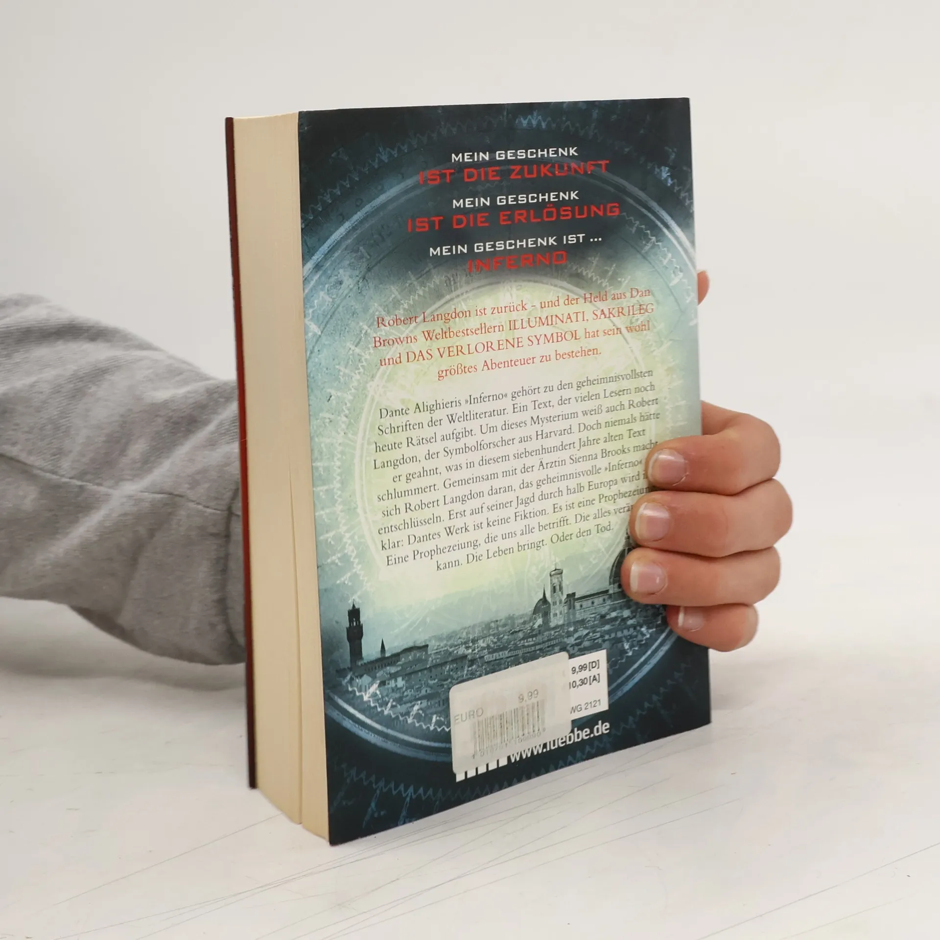 Robert Langdon, Harvard-Professor für Symbologie, erwacht mit einer Schusswunde in einem Krankenhaus in Florenz und hat keine Erinnerung an die letzten zwei Tage. Nach einem Anschlag flieht er mit der jungen Ärztin Sienna Brooks in deren Wohnung. Dort entdeckt er, dass er an der Entschlüsselung einer versteckten Botschaft in einem jahrhundertealten Gemälde zu Dantes „Inferno“ gearbeitet hat. Die Spur führt sie in den Palazzo Vecchio, wo sie sich von Dantes Totenmaske konkrete Hinweise erhoffen, doch diese wurde gestohlen. Langdon und Brooks müssen nun durch halb Europa jagen, um die Maske wiederzufinden und einen perfiden Plan zu vereiteln. Dan Brown, 1964 in New Hampshire geboren, studierte Englisch und Spanisch, bevor er sich Mitte der 90er Jahre ganz dem Schreiben widmete. Sein erster Roman, „Diabolus“, erschien 1998, doch der große Durchbruch kam 2000 mit „Illuminati“, dem ersten Thriller um Langdon. Brown kombiniert geschickt Thriller-Elemente mit religions- und kunsthistorischen Fakten, was ihm ein breites Publikum sichert. Mit diesem Werk präsentiert er den vierten spannenden Thriller um den Symbolologen Robert Langdon.