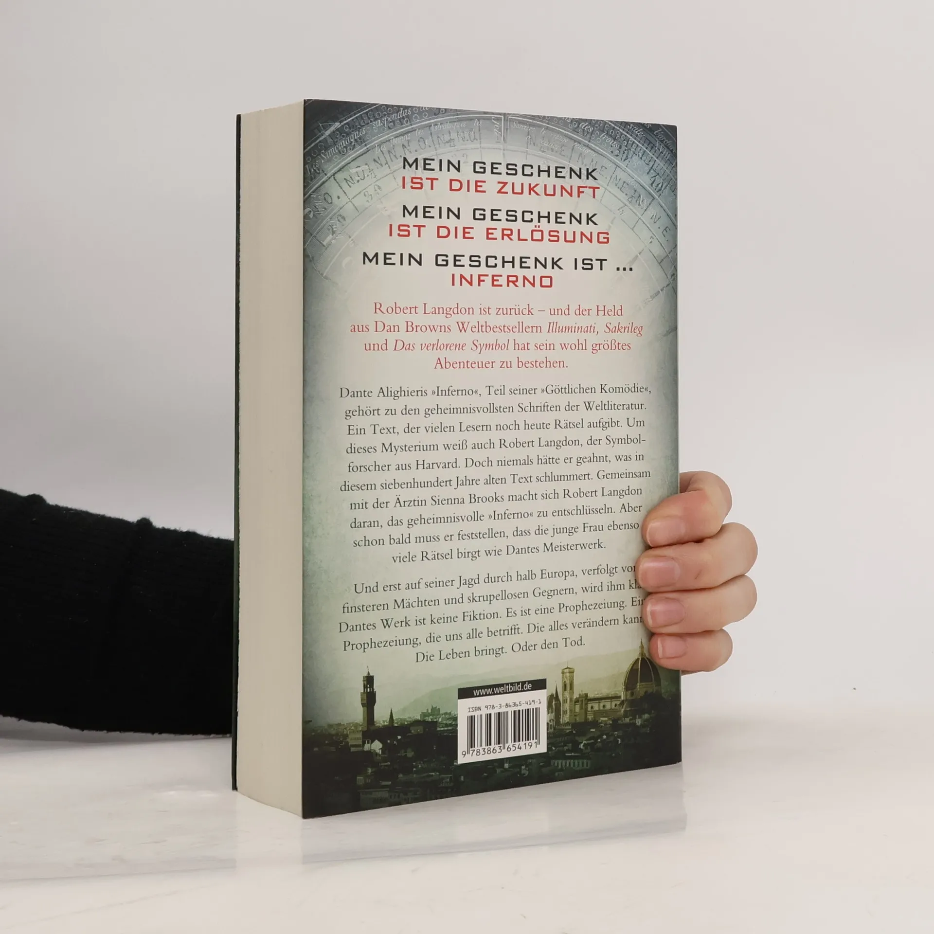 Robert Langdon ist zurück ... und hat sein wohl größtes Abenteuer zu bestehen. Dante Alighieris Inferno, Teil seiner Göttlichen Komödie, gehört zu den geheimnisvollsten Schriften der Weltliteratur. Ein Text, der vielen Lesern noch heute Rätsel aufgibt. Um dieses Mysterium weiß auch Robert Langdon, der Symbolforscher aus Harvard. Doch niemals hätte er geahnt, was in diesem siebenhundert Jahre alten Text schlummert. Und erst auf seiner Jagd durch halb Europa, verfolgt von finsteren Mächten und skrupellosen Gegnern, wird ihm klar: Dantes Werk ist keine Fiktion. Es ist eine Prophezeiung. Eine Prophezeiung, die uns alle betrifft. Die Leben bringt. Oder den Tod.