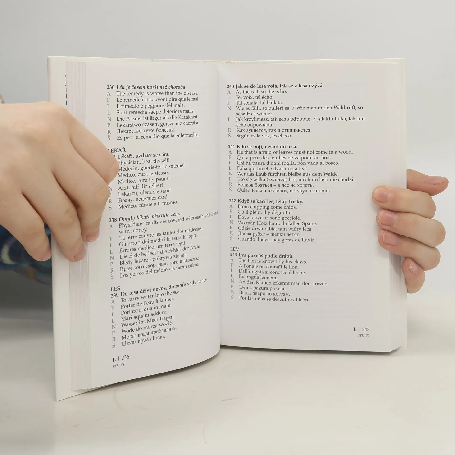 Obsahuje 700 přísloví a pořekadel v češtině, angličtině, francouzštině, italštině, latině, němčině, polštině, ruštině a španělštině.