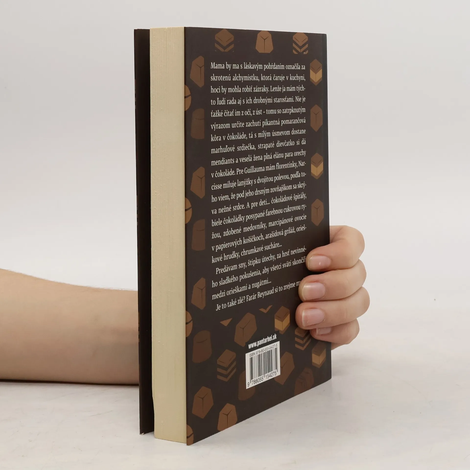 Do tichého francúzskeho mestečka sa prisťahuje záhadná cudzinka Vianne Rocherová s dcérkou a otvorí si priamo oproti kostolu obchodík s čokoládou. Viannin obchodík sa čoskoro stane miestom, kde si ľudia uľavujú na duši, šepkajú si tajomstvá, tkajú jemné sny. Otec Reynaud vidí v prišelkyni vážne nebezpečenstvo pre svoje ovečky predovšetkým preto, že je začiatok pôstu a čokoládu pokladá za zdroj pokušenia. Vyhlasuje proti nej boj. Mestečko sa rozdelí na dva tábory, na tých, čo majú maškrtné jazýčky, a na zarytých odporcov. Vianne sa však nezľakne a na Veľkú noc usporiada Čokoládovú slávnosť, ktorá vyvrcholí čokoládovou bitkou. No môže tam, kde sa pri pohľade na sladké pokušenie zbiehajú slinky, konzervativizmus cirkvi vyhrať svoj márny boj s pohanskou vášňou pre čokoládu? Pri čítaní tohto hravého a trochu nezbedného príbehu je isté jedno: budete mať neprekonateľnú chuť na čokoládu a zároveň vás čaká literárny pôžitok útočiaci na všetky zmysly.