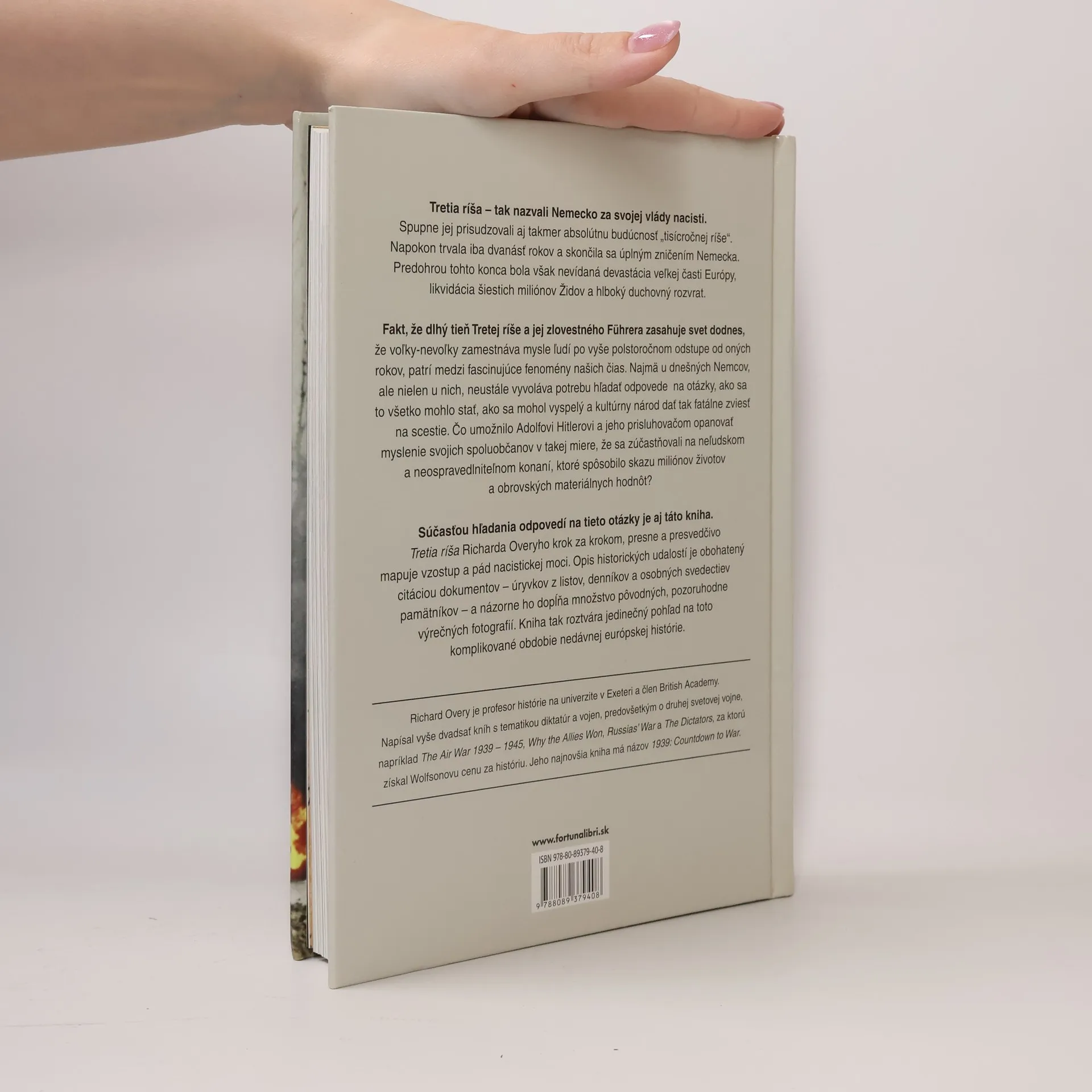 Tretia ríša Richarda Overyho krok za krokom, presne a presvedčivo mapuje vzostup a pád nacistickej moci. Opis historických udalostí je obohatený citáciou dokumentov - úryvkov z listov, denníkov a osobných svedectiev pamätníkov - a názorne ho dopĺňa množstvo pôvodných, pozoruhodne výrečných fotografií. Kniha tak roztvára jedinečný pohľad na toto komplikované obdobie nedávnej európskej histórie.