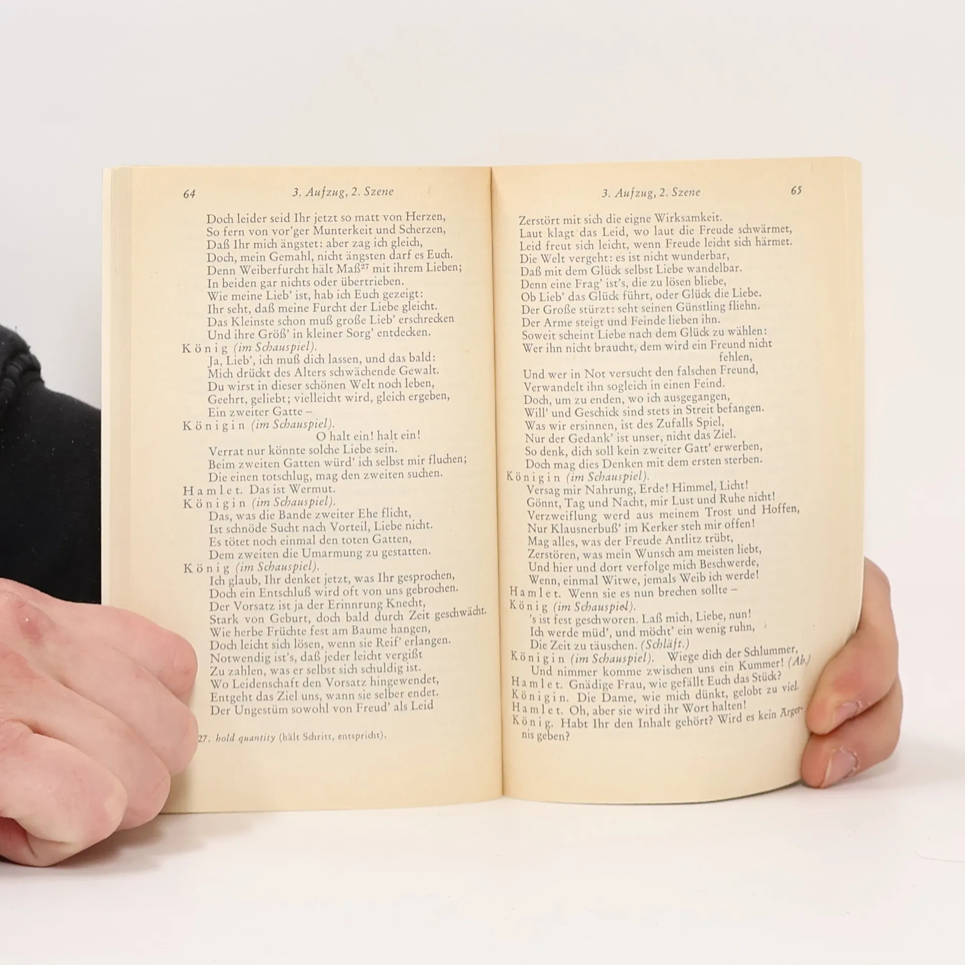 »Hamlet« ist das meistgespielte Stück Shakespeares und die bekannteste Figur des Autors. Vor rund 250 Jahren führte die Shakespeare-Begeisterung in Deutschland zu einem sogenannten ›Hamlet-Erlebnis‹, bei dem sich viele mit dem melancholischen Dänenprinzen identifizierten. Die menschliche Psyche und ihre Widersprüche sowie die Reflexion über Ich, Fiktion und Welt stehen im Mittelpunkt. Der berühmteste Monolog der Theatergeschichte, »To be or not to be, that is the question«, hat hier seinen Platz. Die Schlegel-Tieck-Übersetzung, an der August Wilhelm Schlegel, Ludwig Tieck, Dorothea Tieck und Wolf Heinrich Graf Baudissin mitwirkten, wurde im 19. Jahrhundert zu einem eigenständigen deutschen Klassiker. Die Übersetzer nutzten die Literatursprache der deutschen Klassik im Gefolge Goethes und Schillers und schufen ein poetisches Werk von großer sprachlicher Geschlossenheit und Wirkung – der Text liegt in neuer Rechtschreibung vor. Im Stück heiratet Gertrude, die Witwe des dänischen Königs, dessen Bruder Claudius, der nun König ist. Ihr Sohn Hamlet, benannt nach seinem verstorbenen Vater, sieht den Geist seines Vaters, der ihm offenbart, von Claudius ermordet worden zu sein. Hamlet sinnt auf Rache, was Gertrude, Claudius und auch die geliebte Ophelia, Tochter des Oberkämmerers Polonius, betrifft. Letztlich wird Hamlet von Ophelias Bruder Laertes getötet. Friedrich Schlegel beschreibt das Werk als ein Meisterstück, in dem alle Teil