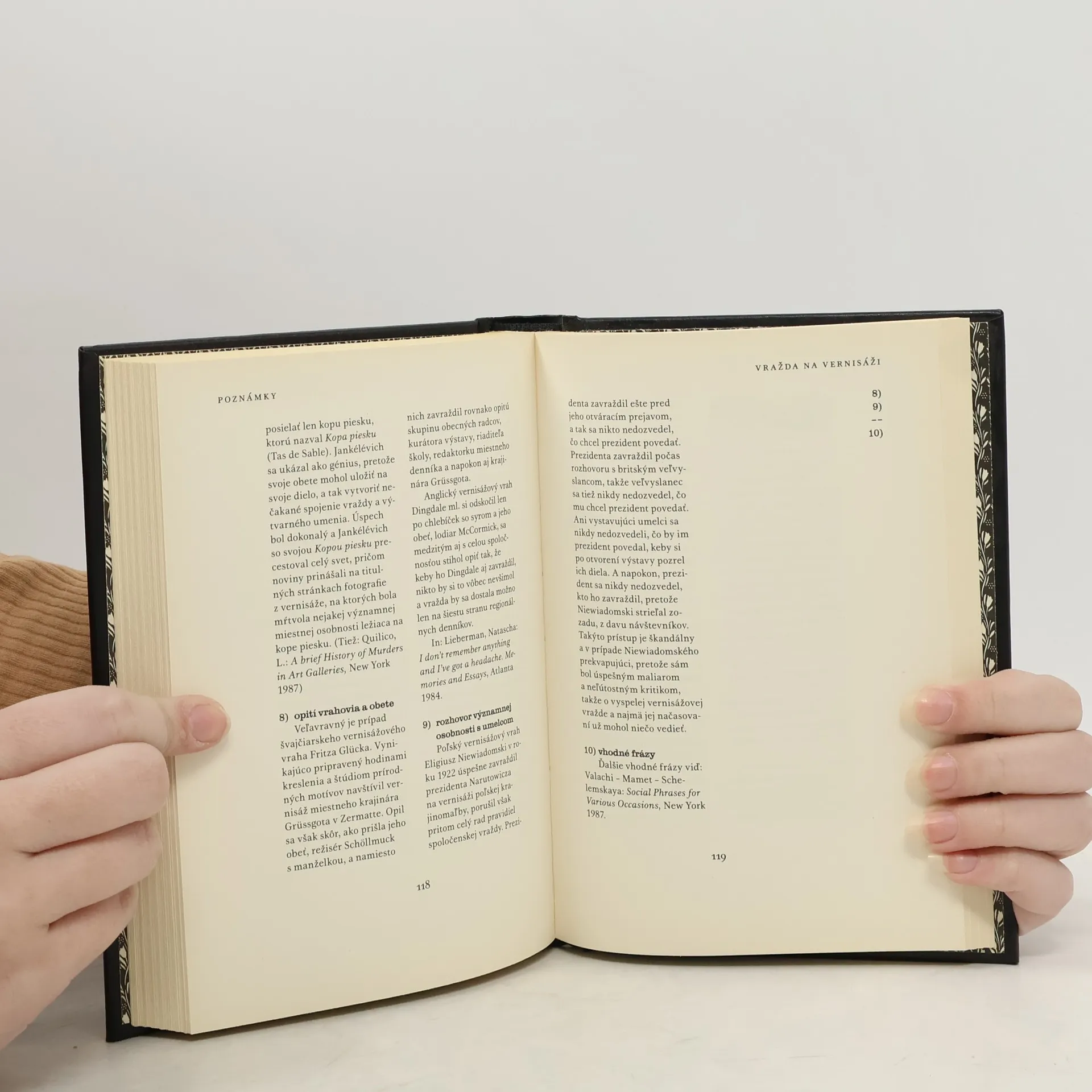 Dielo napísali dvaja americkí väzni, Gutterman a Colohnatt, a poslovenčil Dušann Taragel. Kniha je rozdelená do troch častí: V SPOLOČNOSTI, NA CESTÁCH a INÉ SPOLOČENSKÉ PRÍLEŽITOSTI. Kapitola V SPOLOČNOSTI sa zaoberá vraždami v rôznych prostrediach, ako sú divadlo, koncerty, vernisáže, reštaurácie, recepcie a múzeá. Na CESTÁCH sú opísané vraždy vo vlaku, lietadle, na lodi a počas dovolenky. INÉ SPOLOČENSKÉ PRÍLEŽITOSTI sa zameriavajú na vraždy na svadbách, pohreboch, na pracoviskách, pri návštevách a v rodine. Príloha obsahuje kapitolu o drobných spoločenských príležitostiach, ako sú tanec, ulica a verejná doprava. Kniha obsahuje aj poznámkový aparát, predhovor autorov a k slovenskému vydaniu, pričom ilustrácie vytvoril Jozef Danglár Gertli. Paul Guterman, narodený v New Yorku, mal pohnutý život a stal sa členom detského gangu. Po vojne vo Vietname sa zapojil do zločineckej činnosti a preslávil sa sofistikovanými vraždami, vrátane vyvraždenia predstavenstva firmy Blue Potatoes. V roku 1991 bol odsúdený na 724 rokov. Joe Colohnatt, narodený vo Viedni, sa už ako mladý zapojil do pašovania a stal sa známym v zločineckej smotánke. Po presťahovaní do USA pracoval pre rodinný klan Bonanno a neskôr sa osamostatnil. Preslávil sa vraždami celebrít a bol odsúdený na 374 rokov.