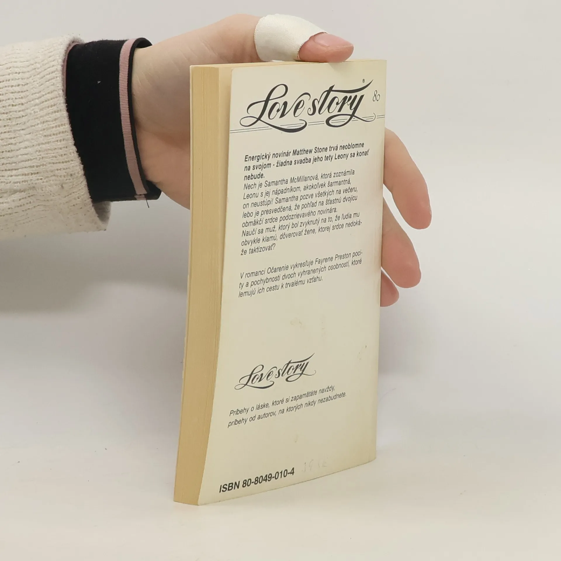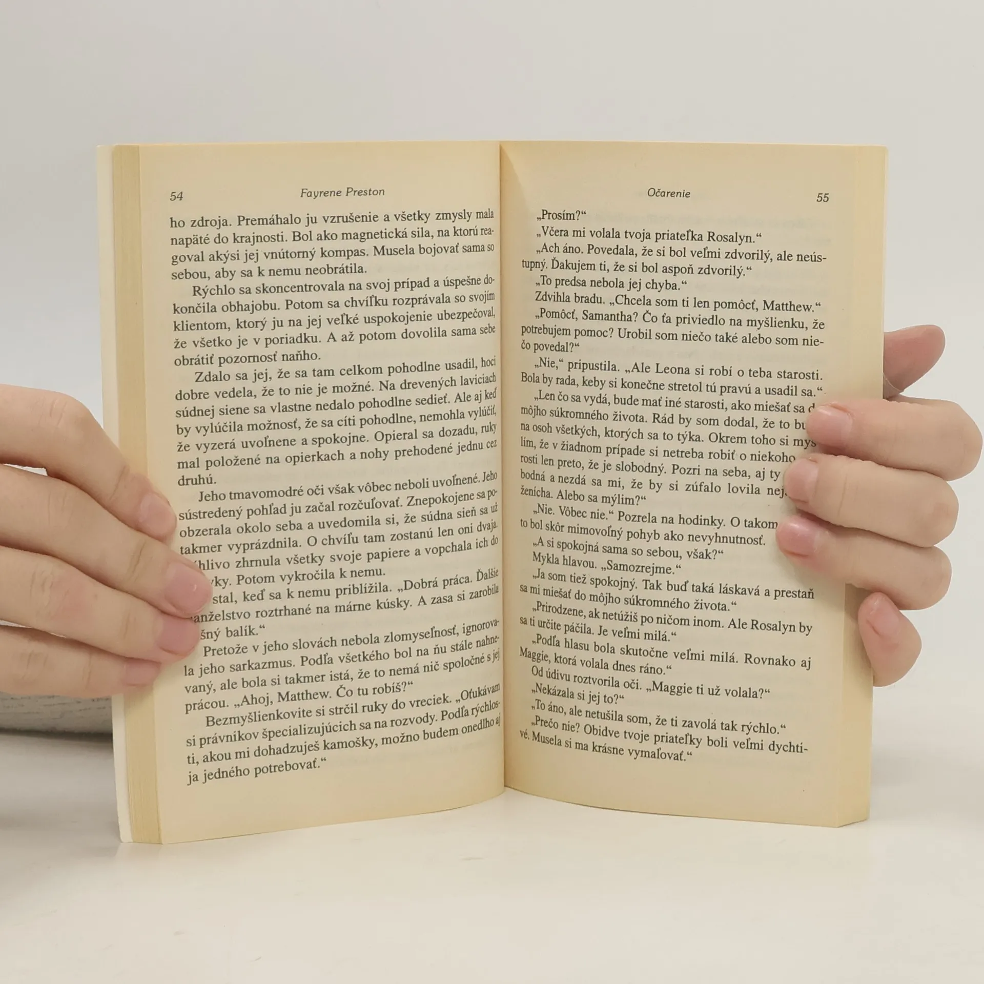 Energický novinár Mathew Stone trvá neoblomne na svojom - žiadna svadba jeho tety Leony sa konať nebude. Nech je Samantha McMillanová, ktorá zoznámila Leonu s jej nápadníkom, akokoľvek šarmantná, on neustúpi! Samantha pozve všetkých na večeru, lebo je presvedčená, že pohľad na šťastnú dvojicu obmäkčí srdce podozrievavého novinára. Naučí sa muž, ktorý bol zvyknutý na to, že ľudia mu obvykle klamú, dôverovať žene, ktorej srdce nedokáže taktizovať? V romanci Očarenie vykresľuje Fayrene Preston pocity a pochybnosti dvoch vyhranených osobností, ktoré lemujú ich cestu k trvalému vzťahu.