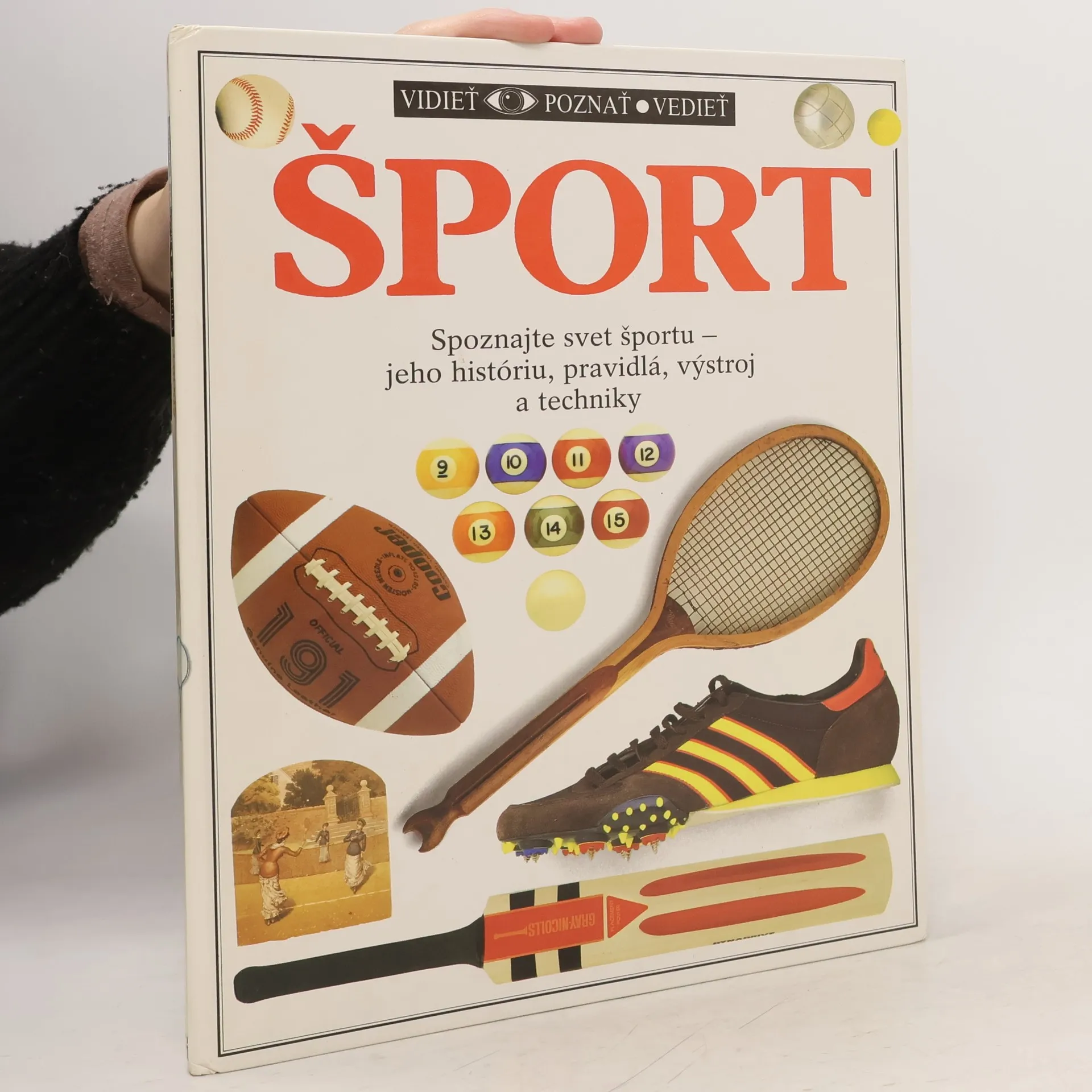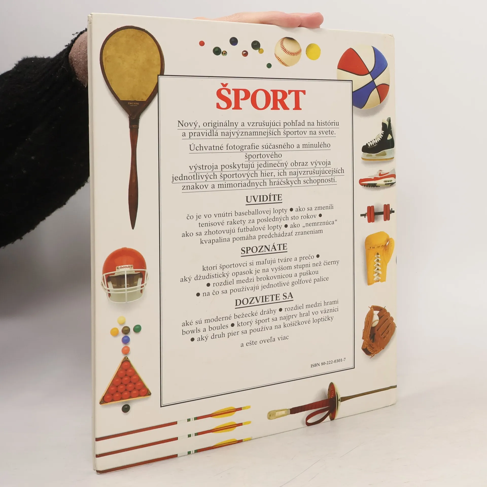 Originálny a vzrušujúci pohľad na históriu a pravidlá hlavných svetových športov. Udivujúce, reálne fotografie moderných a starodávnych výstrojí a výzbrojí poskytujú jedinečnú možnosť vidieť a spoznať vývoj každej hry, jej vzrušujúce črty a špeciálne zručnosti, ktoré potrebujú hráči. Uvidíte, čo je vo vnútri baseballového loptičky, ako sa zmenili tenisové rakety za posledných sto rokov, ako sa vyrábajú futbalové lopty, ako "nemrznúca" kvapalina pomáha predchádzať zraneniam. Poznáte, ktorí športovci používajú "vojenské líčenie" a prečo, ktorý pás v džude je vyšší než čierny, rozdiel medzi pištoľou a puškou, na čo sa používajú jednotlivé golfové palice. Dozviete sa, z čoho sú vyrobené moderné bežecké dráhy, rozdiel medzi bowls a boules, ktorý šport sa najskôr hral vo väzení, aký druh peria sa používa pri výrobe opeřených loptičiek a oveľa viac.