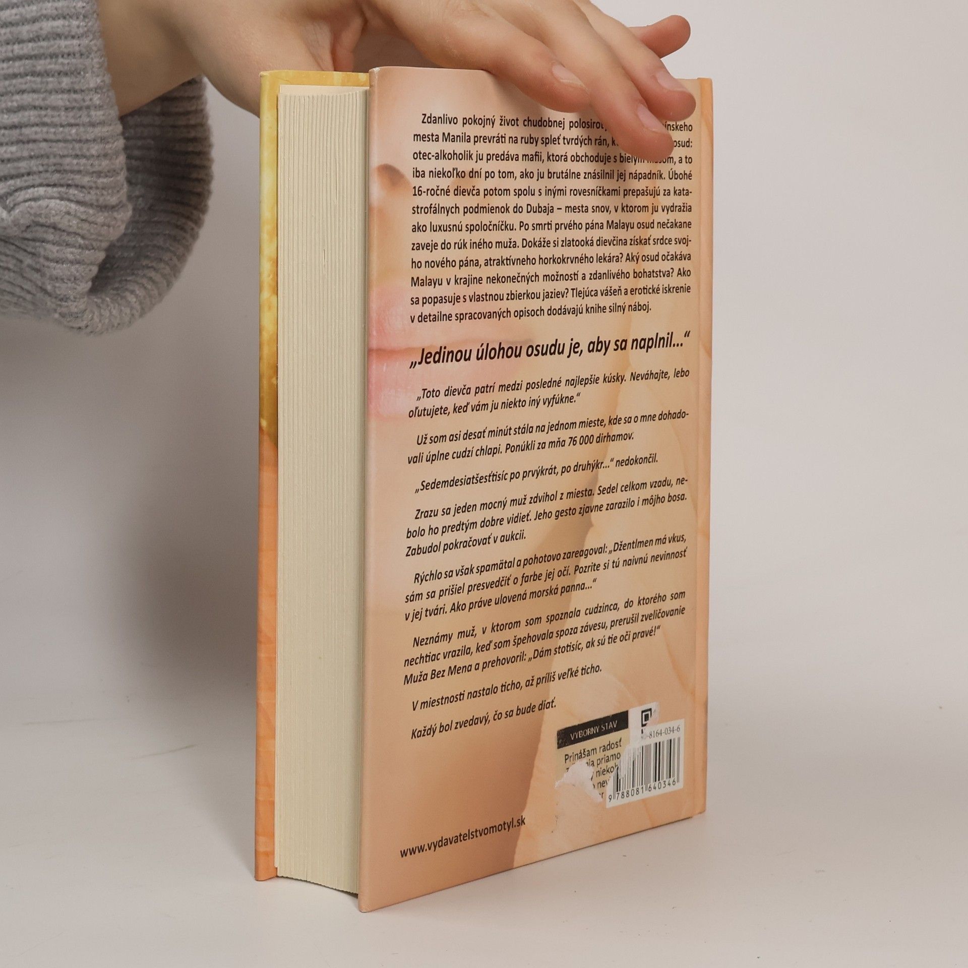 Jedinečná, šokujúca kniha mladej autorky! Zdanlivo pokojný život chudobnej polosiroty Malaye z filipínskeho mesta Manila prevráti na ruby spleť tvrdých rán, ktoré jej uštedrí osud: otec-alkoholik ju predáva mafii, ktorá obchoduje s bielym mäsom, a to iba niekoľko dní po tom, ako ju brutálne znásilnil jej nápadník. Úbohé 16-ročné dievča potom spolu s inými rovesníčkami prepašujú za katastrofálnych podmienok do Dubaja – mesta snov, v ktorom ju vydražia ako luxusnú spoločníčku. Po smrti prvého pána Malayu osud nečakane zaveje do rúk iného muža. Dokáže si zlatooká dievčina získať srdce svojho nového pána, atraktívneho horkokrvného lekára? Aký osud očakáva Malayu v krajine nekonečných možností a zdanlivého bohatstva? Ako sa popasuje s vlastnou zbierkou jaziev? Tlejúca vášeň a erotické iskrenie v detailne spracovaných opisoch dodávajú knihe silný náboj. „Jedinou úlohou osudu je, aby sa naplnil...“