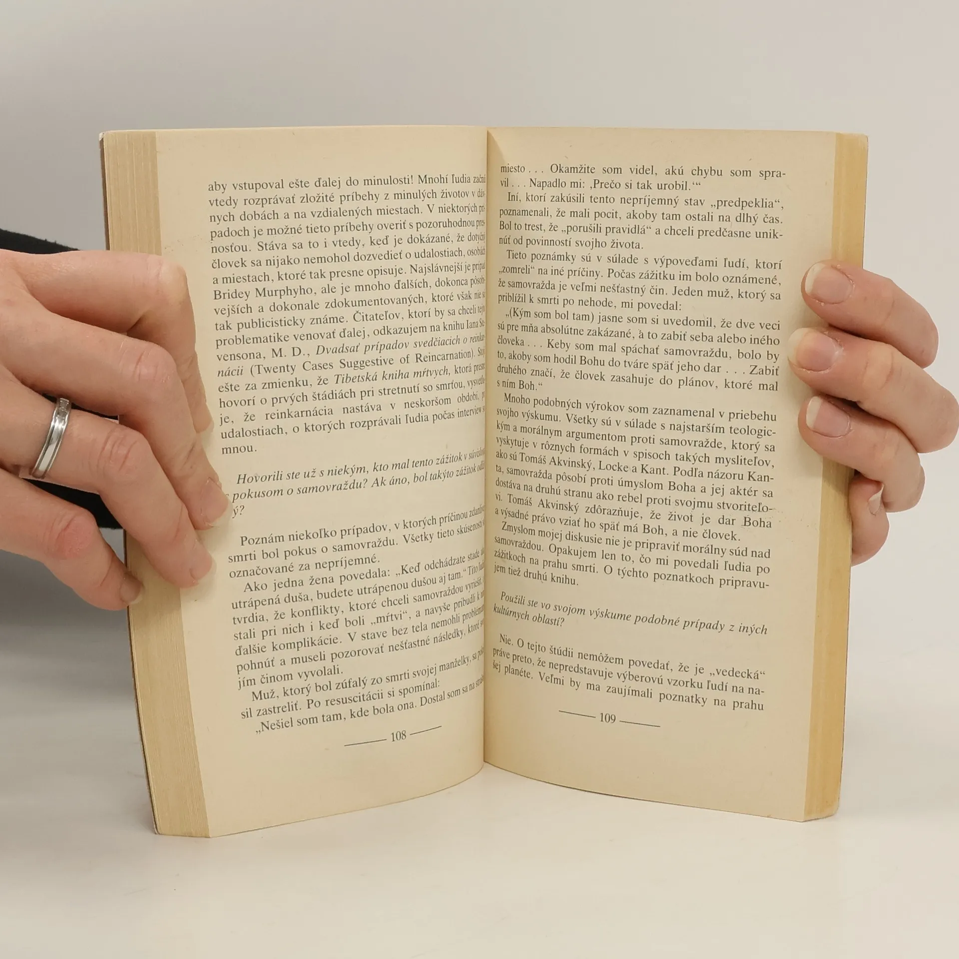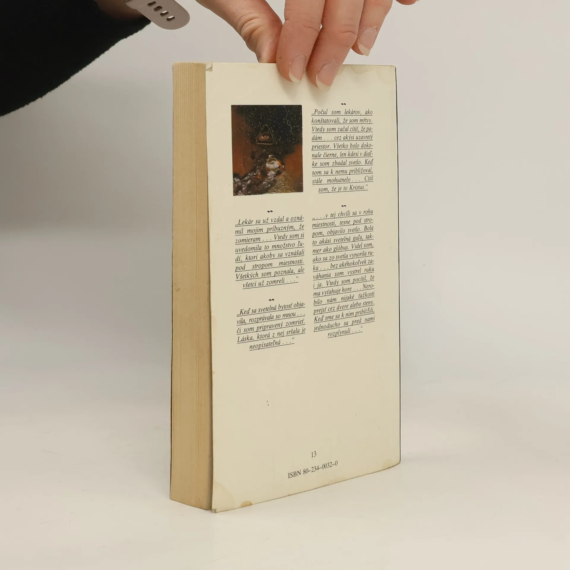 „Lekár sa už vzdal a oznámil mojim príbuzným, že zomieram . . . Vtedy som si uvedomila to množstvo ľudí, ktorí akoby sa vznášali pod stropom miestnosti. Všetkých som poznala, ale všetci už zomreli. . . “ „Keď sa svetelná bytosť objavila, rozprávala so mnou . . . či som pripravený zomrieť. Láska, ktorá z nej sršala je neopísateľná . . .“ ".....v tej chvíli sa v rohu miestnosti, tesne pod stropom, objavilo svetlo. Bola to akási svetelná guľa, takmer ako glóbus. Videl som, ako sa zo svetla vynorila ruka .. . bez akéhokoľvek zaváhania som vystrel ruku i ja. Vtedy som pocítil, že ma vyťahuje hore . . . Nerobilo nám nijaké ťažkosti prejsť cez dvere alebo steny. Keď sme sa k nim priblížili, jednoducho sa pred nami rozplynuli..." „Počul som lekárov, ako konštatovali, že som mŕtvy. Vtedy som začal cítiť, že padám . . . cez akýsi uzavretý priestor. Všetko bolo dokonale čierne, len kdesi v diaľke som zbadal svetlo. Keď som sa k nemu približoval, stále mohutnelo . . . Cítil som, že je to Kristus. “