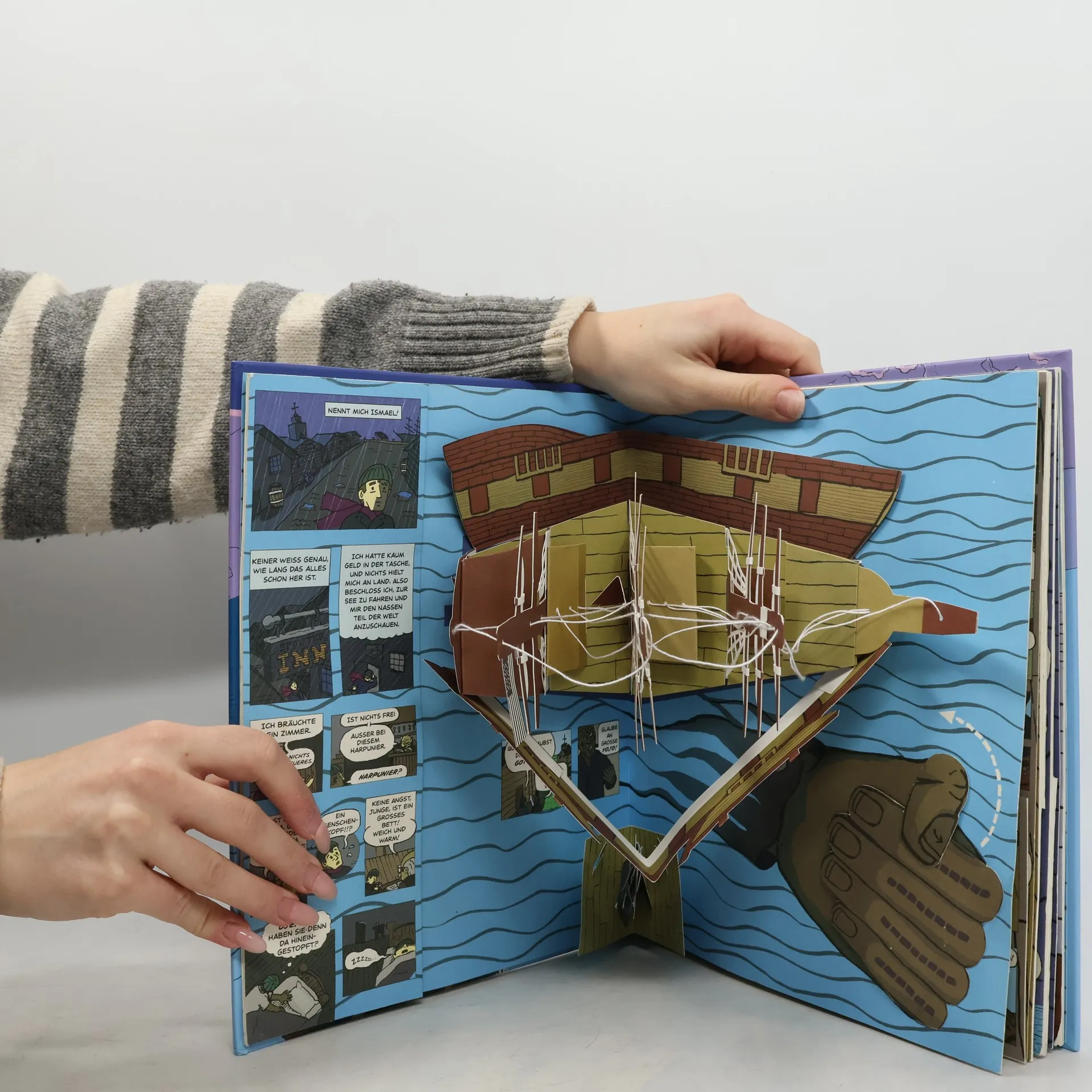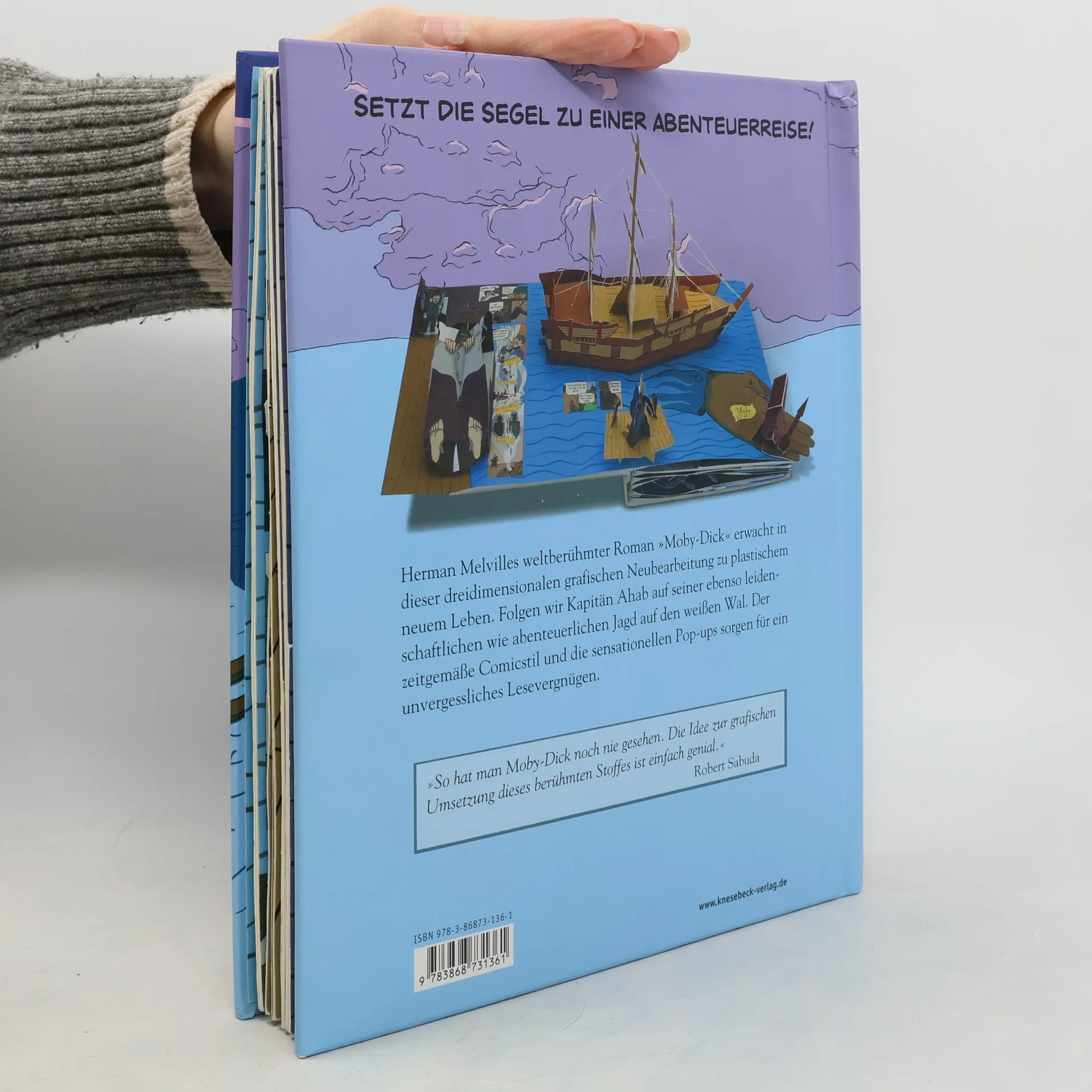 Moby Dick als Pop-up – lebendiger denn je! Herman Melvilles weltberühmter Roman erwacht in dieser einzigartigen Bearbeitung zu neuem Leben. Die spektakulären 3-D-Effekte der aufklappbaren Doppelseiten folgen den wichtigen Etappen des Romans und setzen das Geschehen in eine eigene, frische Bildsprache um: die Begegnung zwischen Ismael und Quiqueg, ihr Anheuern auf dem Walfänger, Kapitän Ahabs legendäre Rede vom weißen Wal, bis hin zum spannenden Ende ... Der zeitgemäße Comic Stil und die sensationellen Pop-ups sorgen für ein unvergessliches Lesevergnügen.