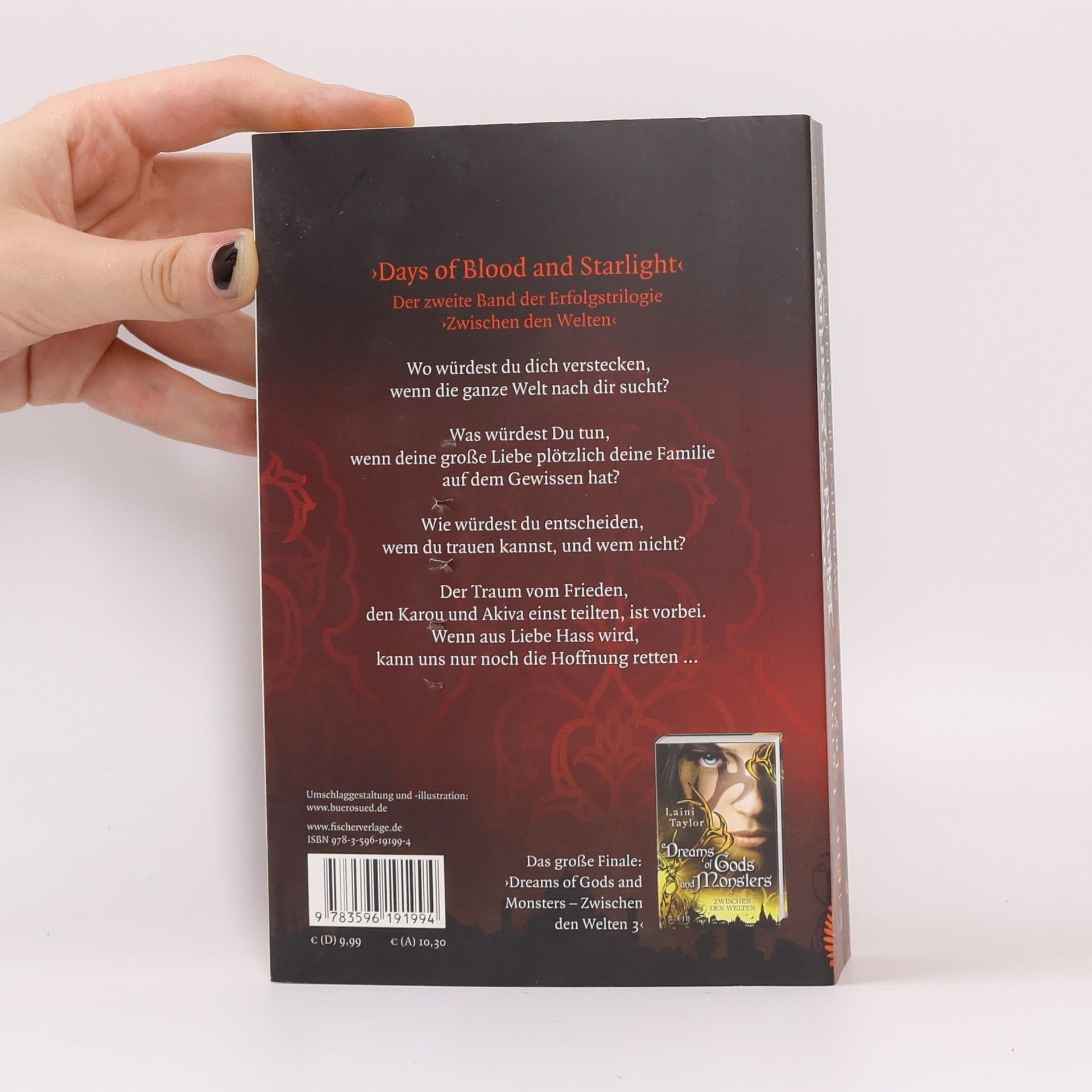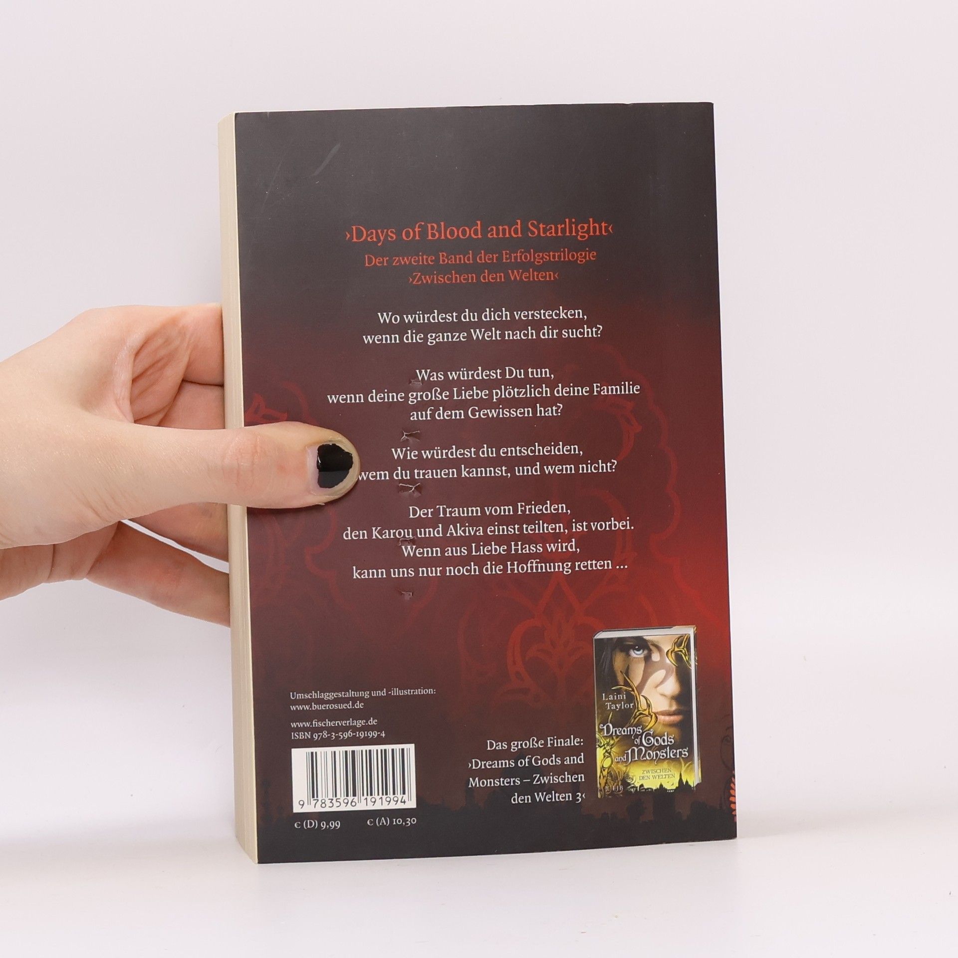 Im zweiten Band der Trilogie steht Karou vor einer ausweglosen Situation: Ihre große Liebe, der Seraph Akiva, ist für den Tod ihrer Familie verantwortlich. Der einstige Traum von Frieden zwischen den Chimären und Seraphim ist zerbrochen, und Karou hat nur ein Ziel: den jahrtausendealten Krieg zu beenden. Gemeinsam mit Thiago, dem Weißen Wolf, zieht sie sich in die Wüste Marokkos zurück, um eine neue Armee aus Monstern zu formen. Dabei möchte sie ihre beste Freundin Zuzana aus den Konflikten heraushalten, doch Zuzana ist nicht leicht zu bremsen. Akiva hingegen fühlt sich von seiner Schuld erdrückt. In dem Glauben, Karou sei tot, handelte er aus einem Irrtum heraus und plant nun einen gefährlichen Verrat an seinen eigenen Leuten, um seine Tat zu sühnen. Doch wird sein Plan gelingen? Und kann Karou ihre Trauer überwinden und Akiva jemals verzeihen? Die Geschichte entfaltet sich in einem Spannungsfeld zwischen Liebe, Hass und Hoffnung, während die Protagonisten versuchen, ihren Platz in einer zerbrochenen Welt zu finden.