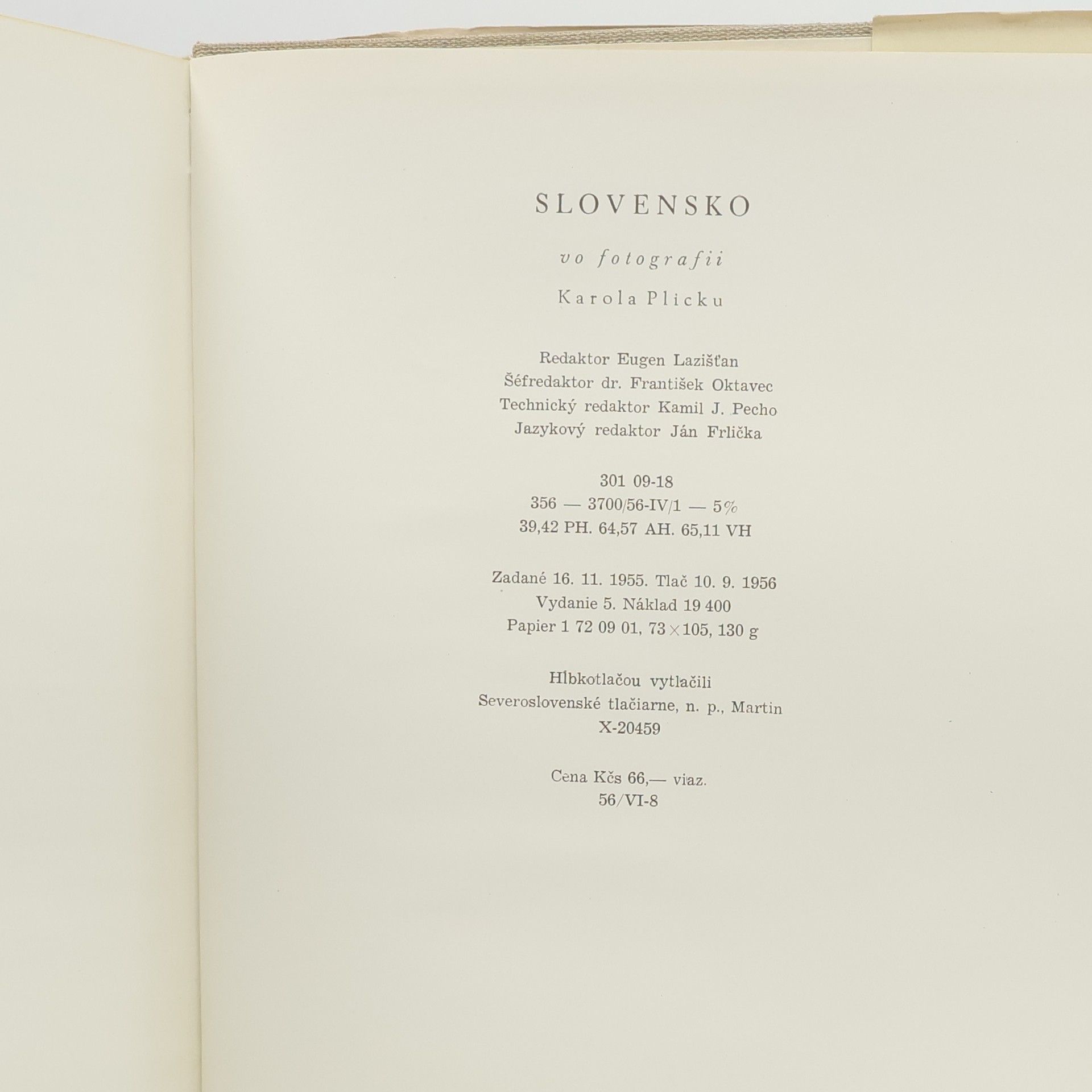 Fotografie Karola Plicky, které sám pro tuhle publikaci vybral a mapuje Slovensko těch časů - Celkem 224 hnědobílých celostránkových fotografií (snímok) - dokonale reprodukované čarovné Plickové fotografické zábery. - Kníha je pokladnicou umenia minulosti, pokladnicou živých i zabúdaných tradícií ľudových, uchovávateľom rázovitých typov slovenských ľudí. Je vznešeným, hymnickým spevom Slovenska. prvé vydanie, 620 Kčs.
