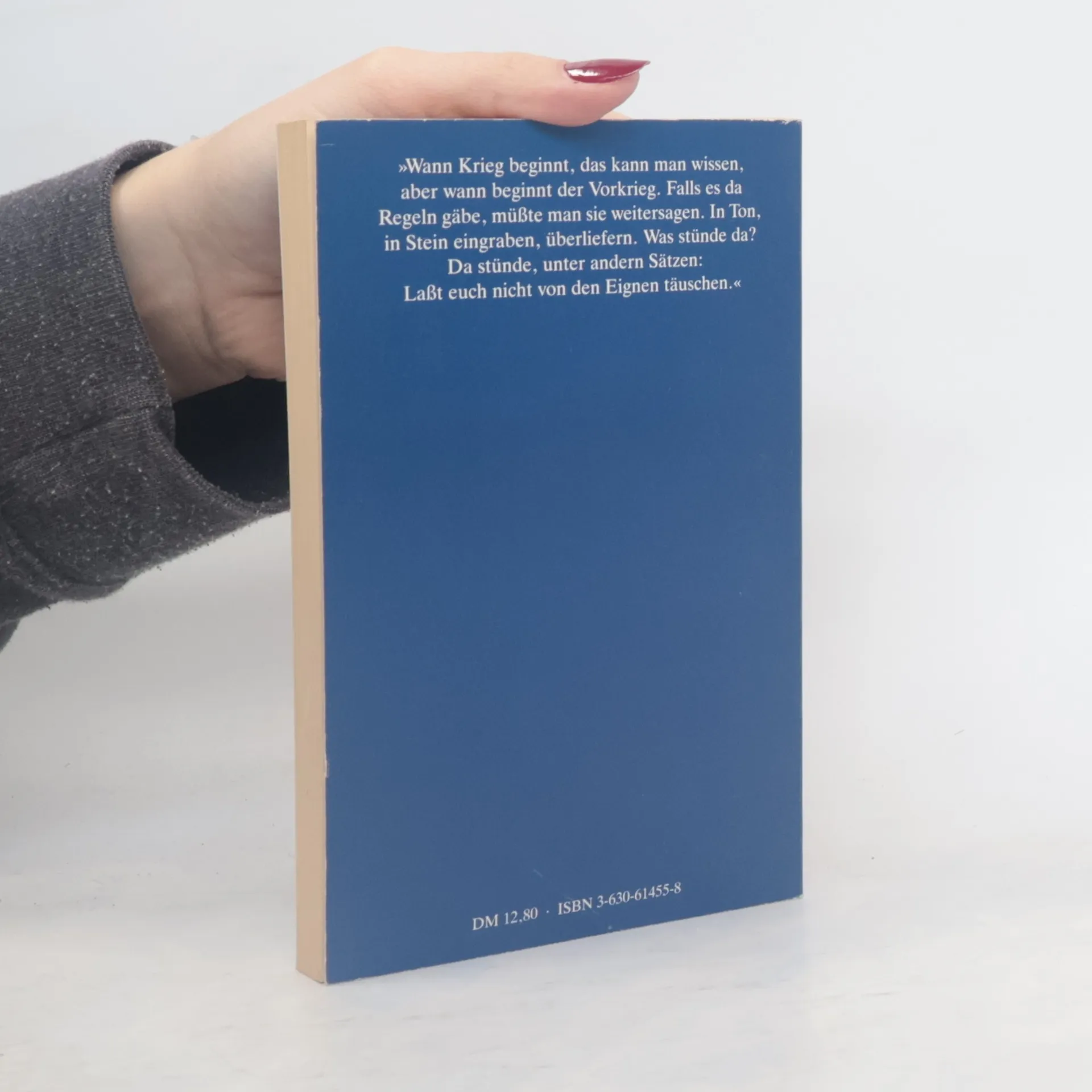 \"Wann Krieg beginnt, das kann man wissen, aber wann beginnt der Vorkrieg. Falls es da Regeln gäbe, müßte man sie weitersagen. In Ton, in Stein eingraben, überliefern. Was stünde da? Da stünde, unter andern Sätzen: Laßt euch nicht von den Eignen täuschen.\"